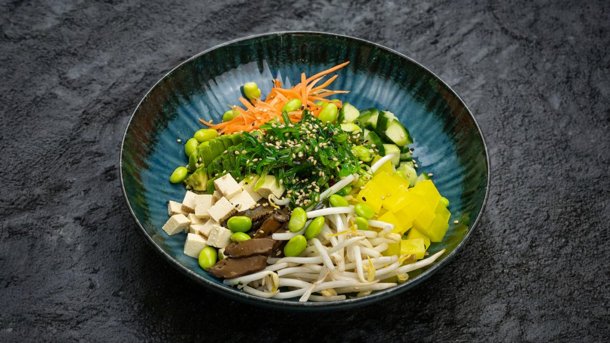 füstölt tofu, shiitake gomba, edamame bab, avokádó, répa, uborka, wakame, oshinko, mungóbabcsíra, jázmin rizs vagy saláta, plusz választható szósz