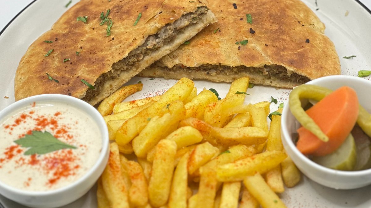 Pácolt marhahús kenyérben, Hasábburgonya. Savanyúság és Tahini sauce