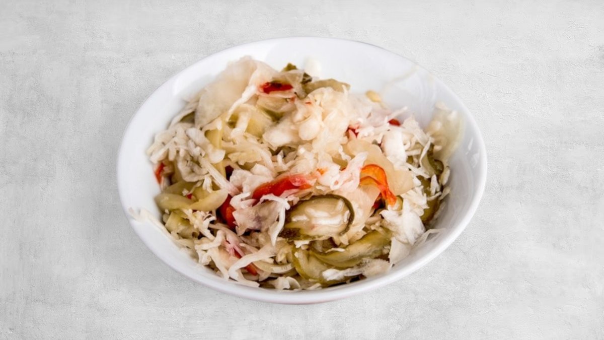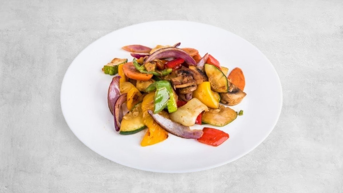 Apróra vágott zöldsaláta, paradicsom, uborka, sárgarépa és keleti titkos öntet.