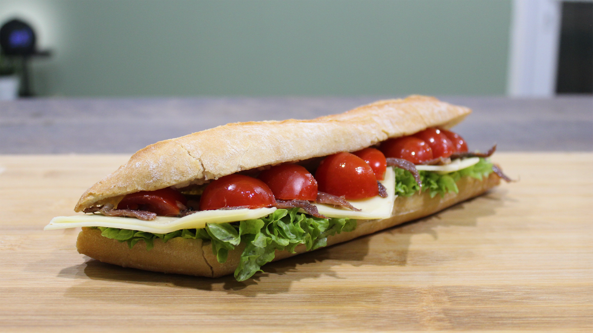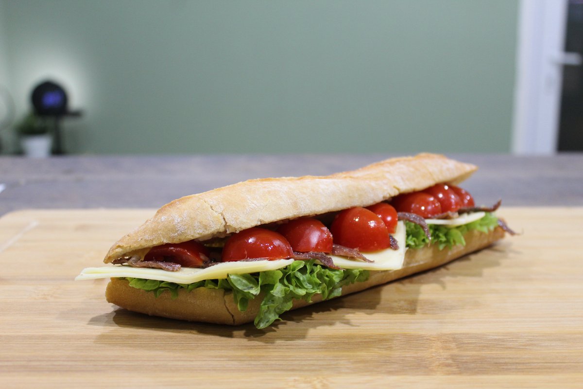 Ciabatta, saláta, szardella, paradicsom, édes sajt.