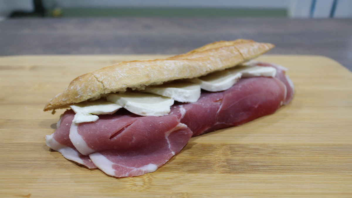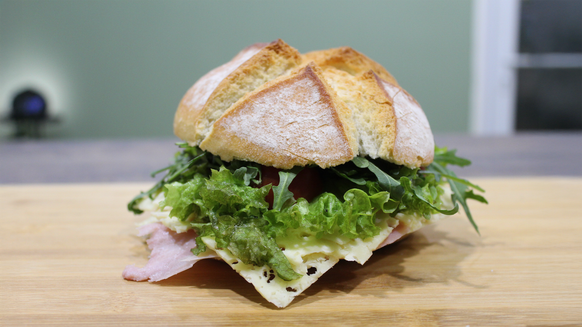 Olasz zsemle, sonka, svájci sajt, saláta, paradicsom, rukkola