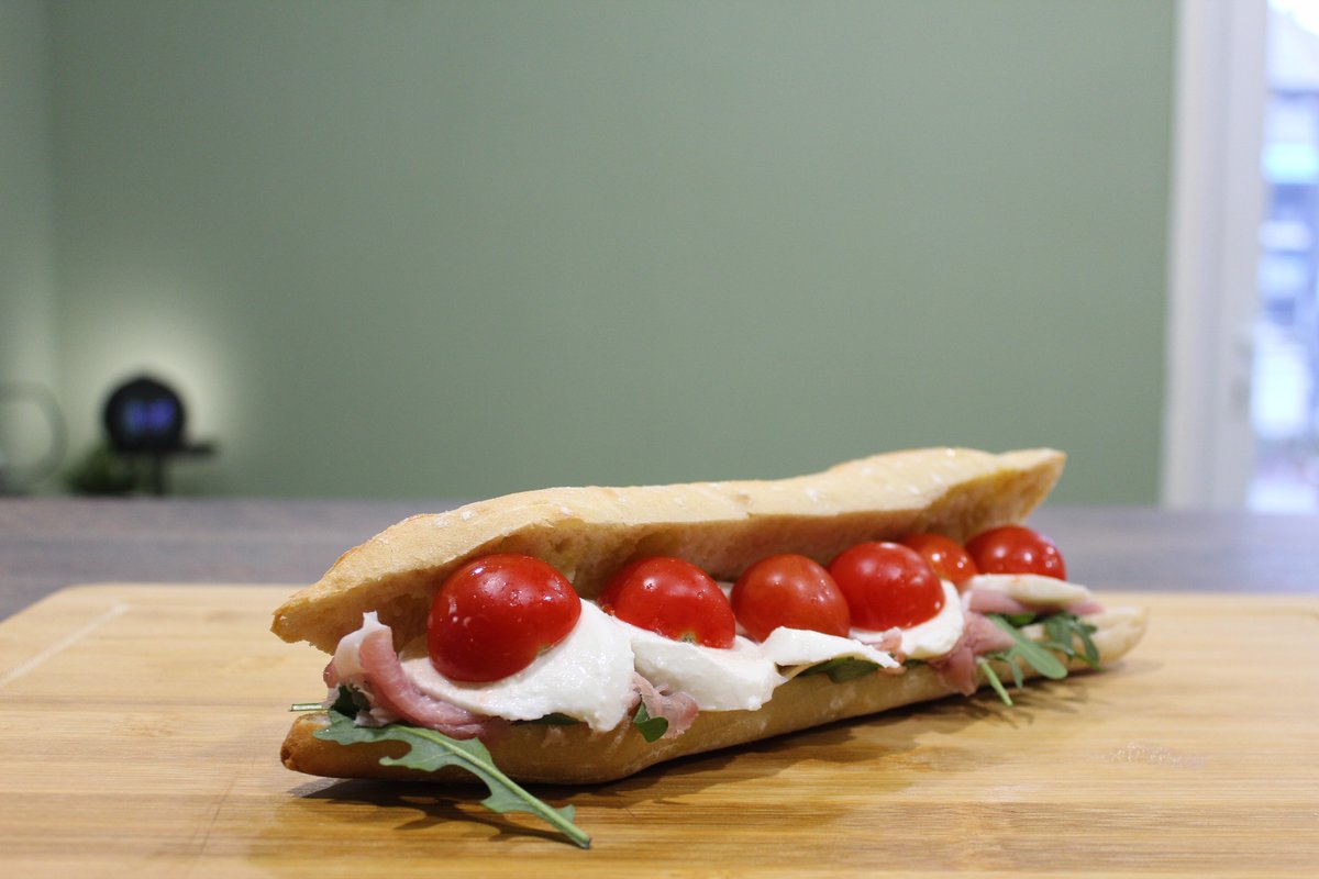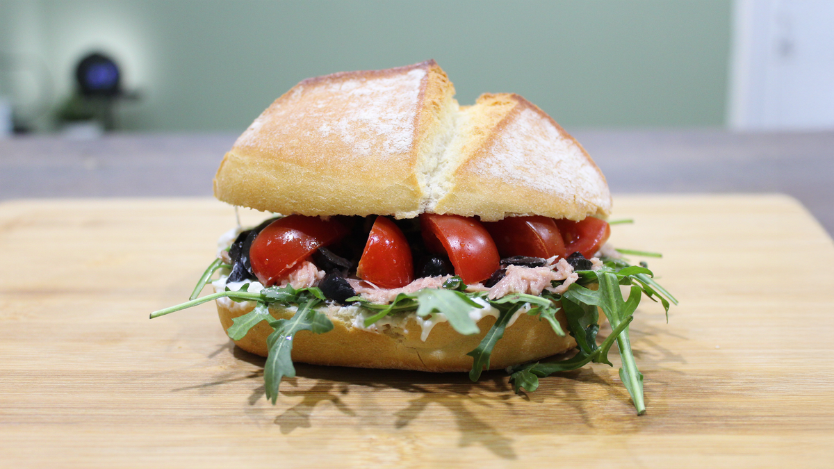 Olasz zsemle, tonhal, olajbogyó, paradicsom, stracciatella, rukkola