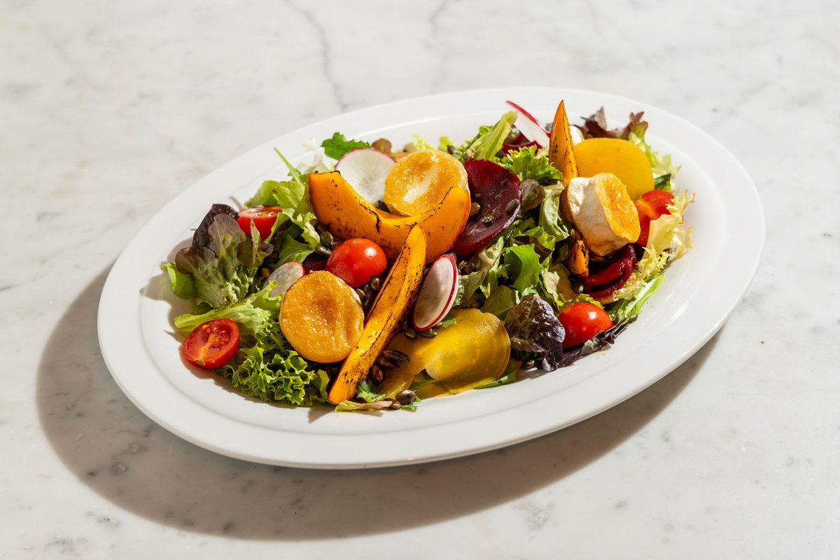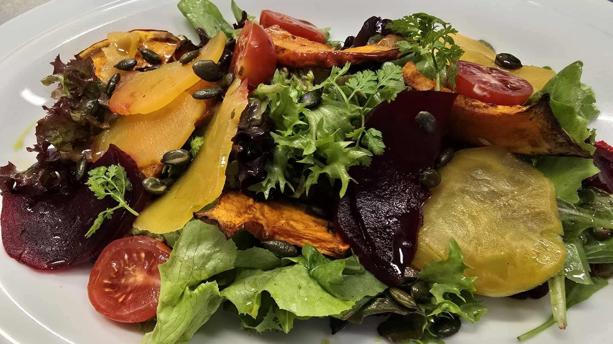 vegyes kevert salátával,sütőtökkel savanyított céklával, koktélparadicsommal, tökmaggal és citrusos öntettel