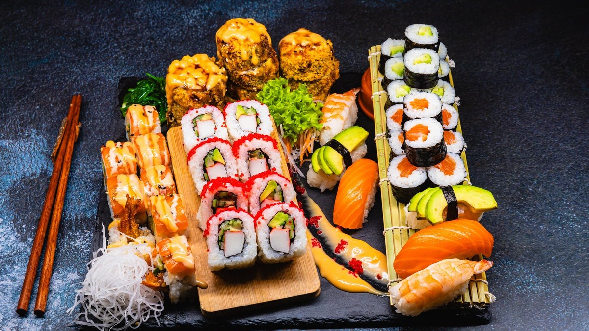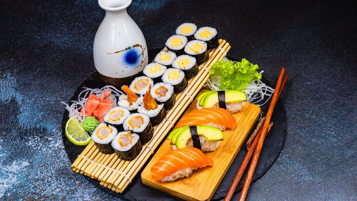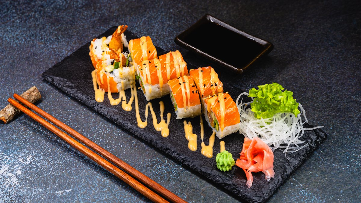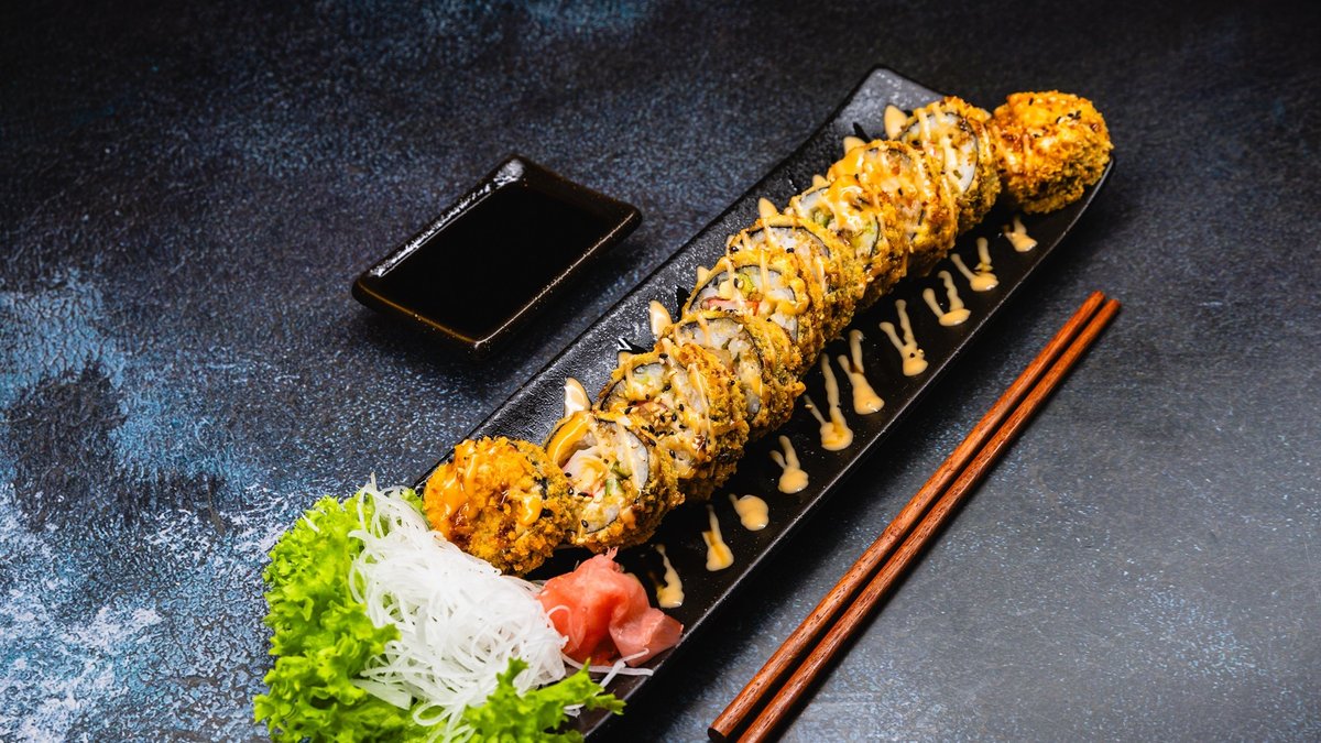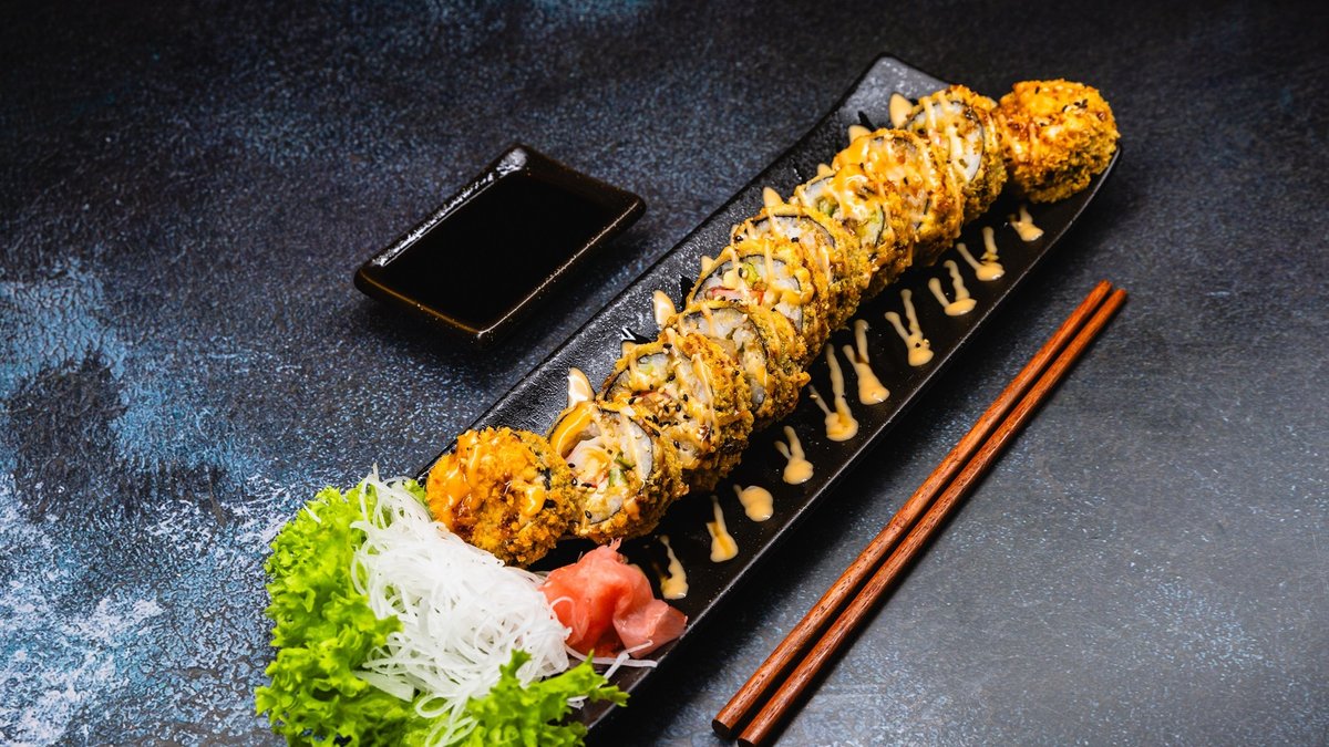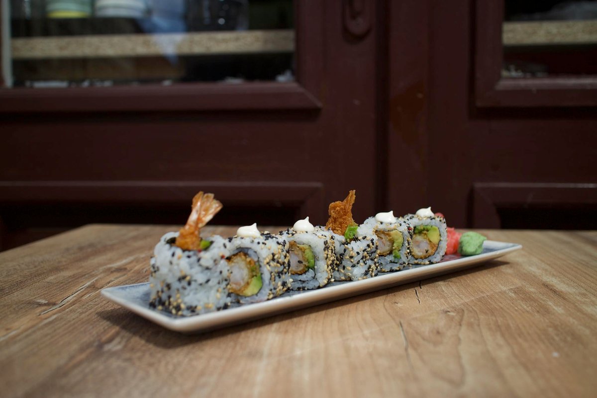 szezám, tempura rák, avokádó, chili majonéz sesame, tempura shrimp, avocado, chilli mayonnaise