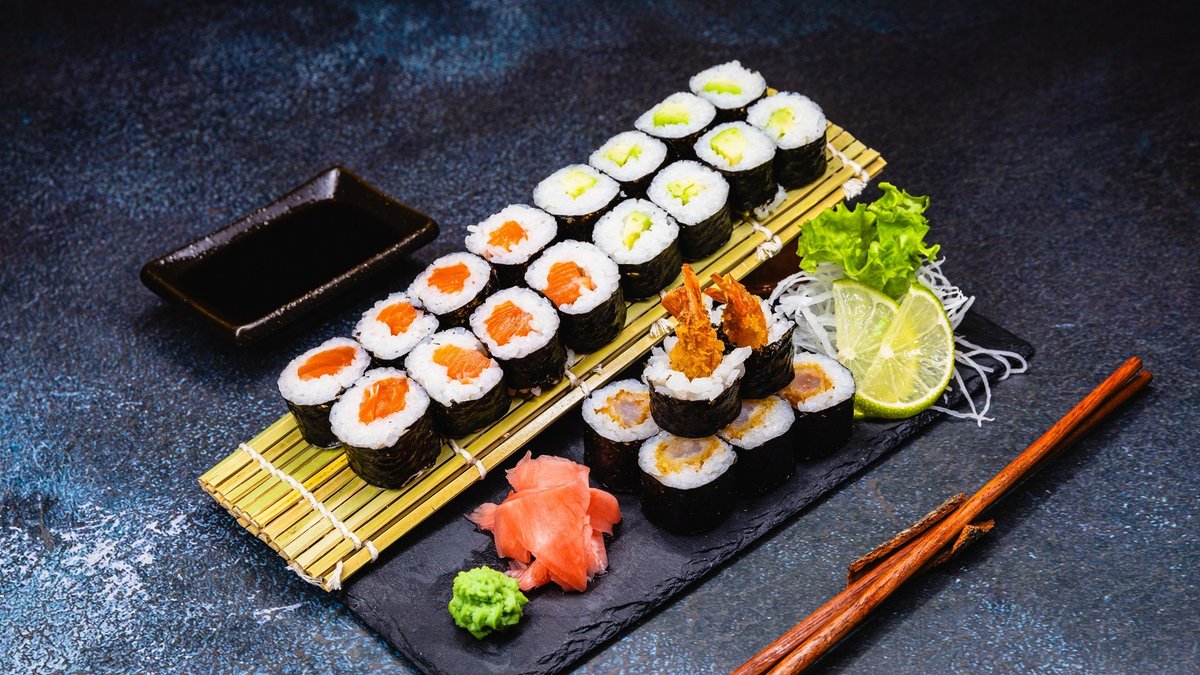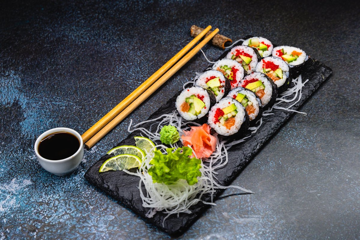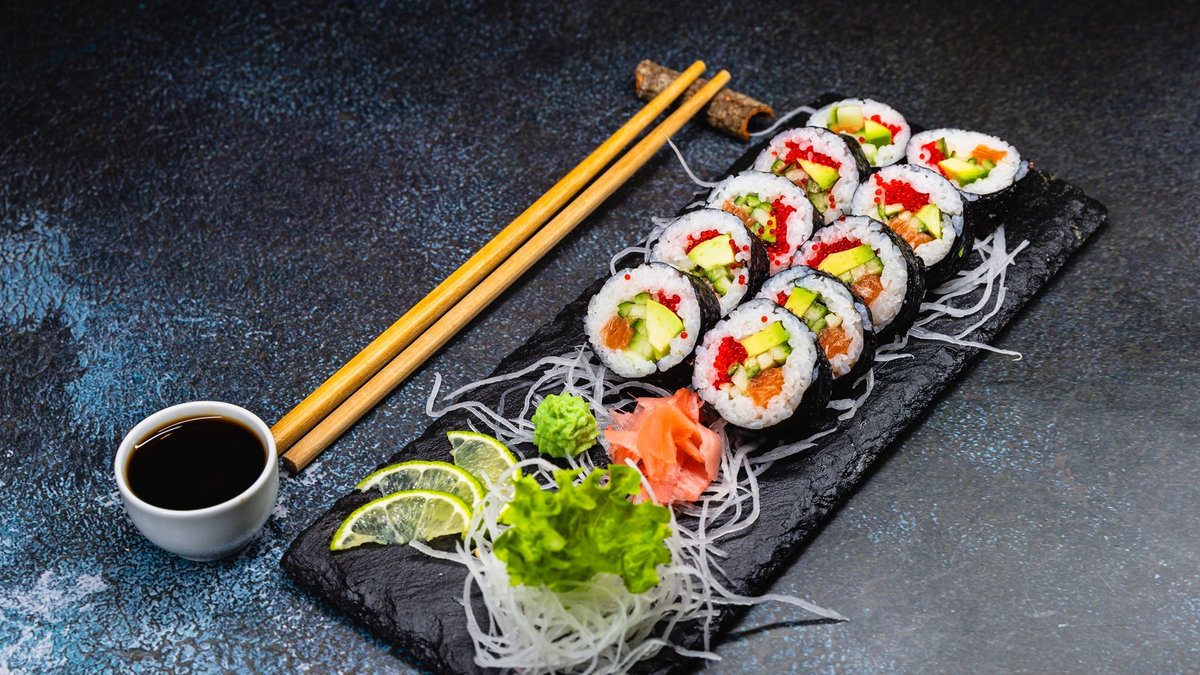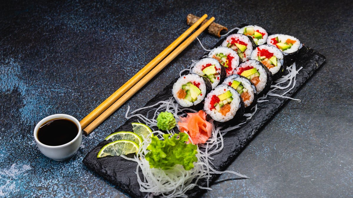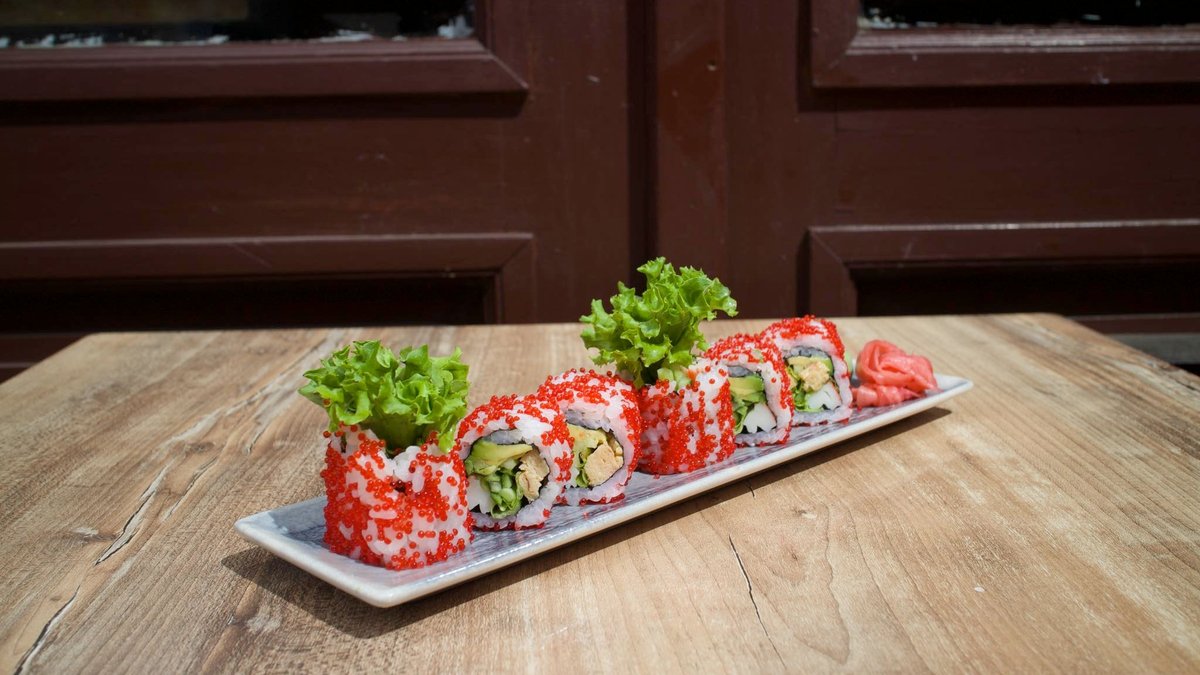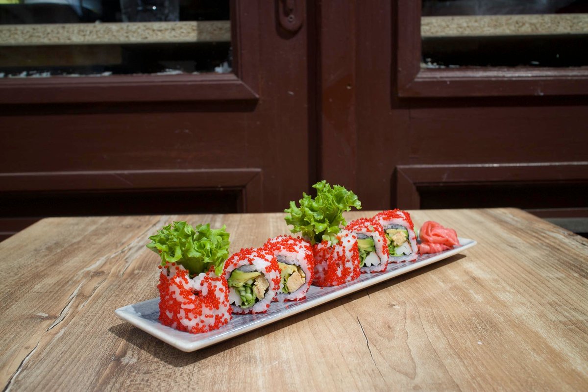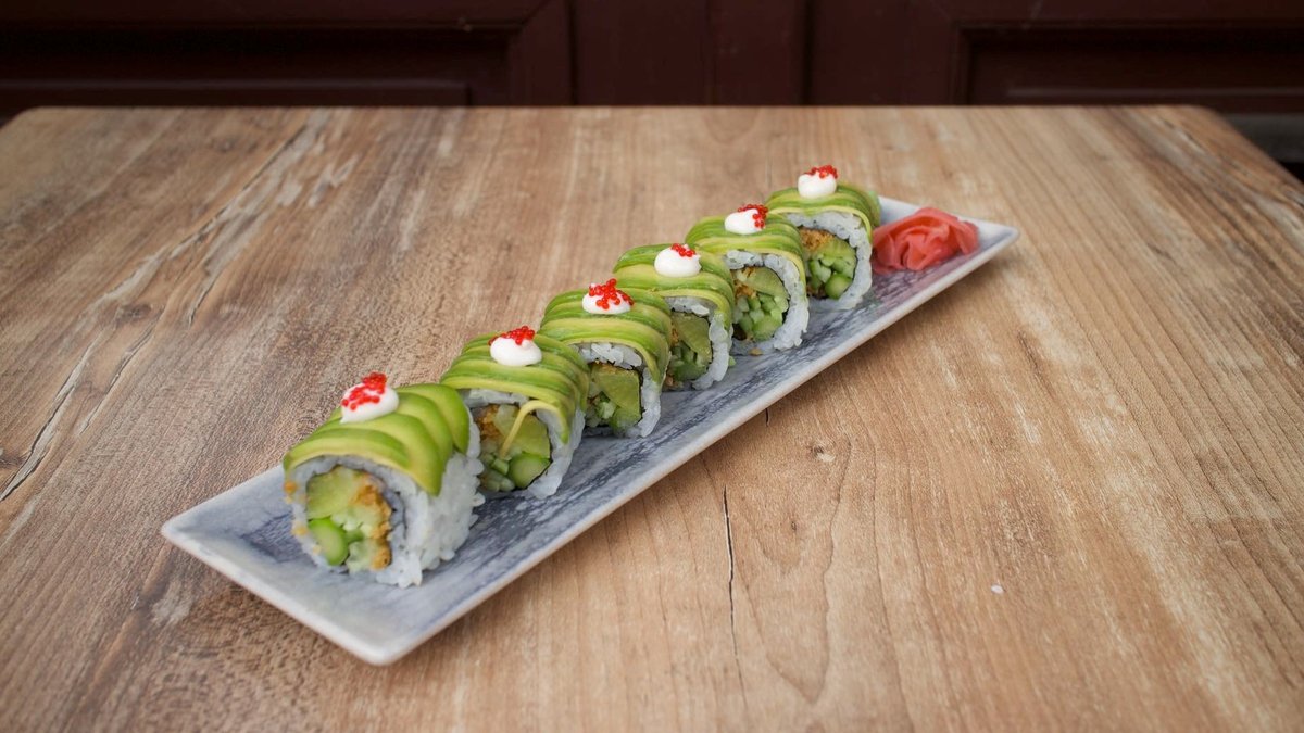 masago, tempura rák, avokádó, uborka masago, tempura shrimp, avocado, cucumber