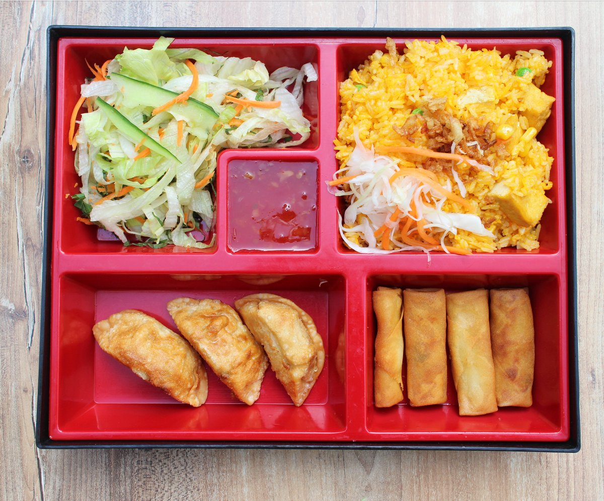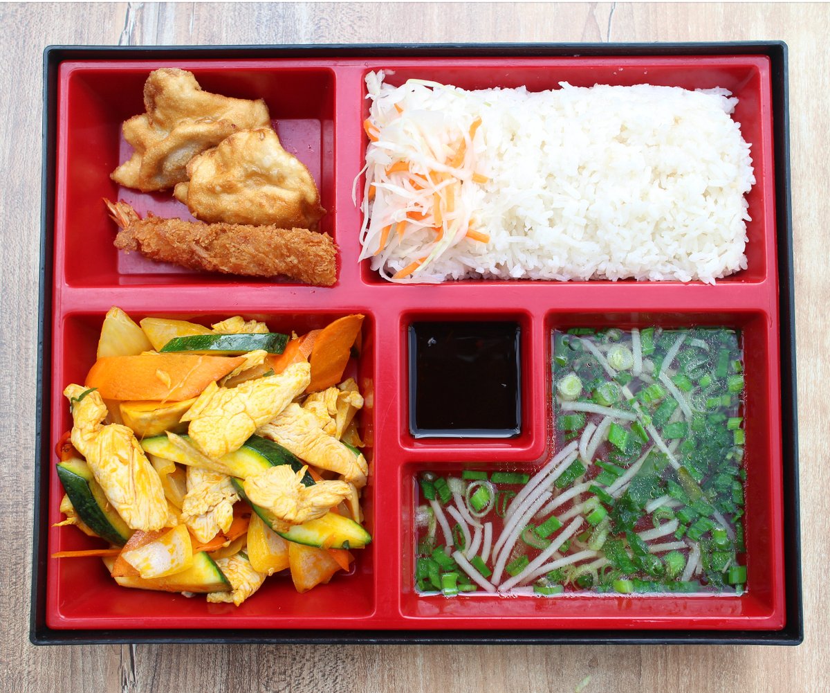 párolt rizs, pankómorzába panírozott csirke, vegyes saláta steamed rice, tempura chicken, mixed salad