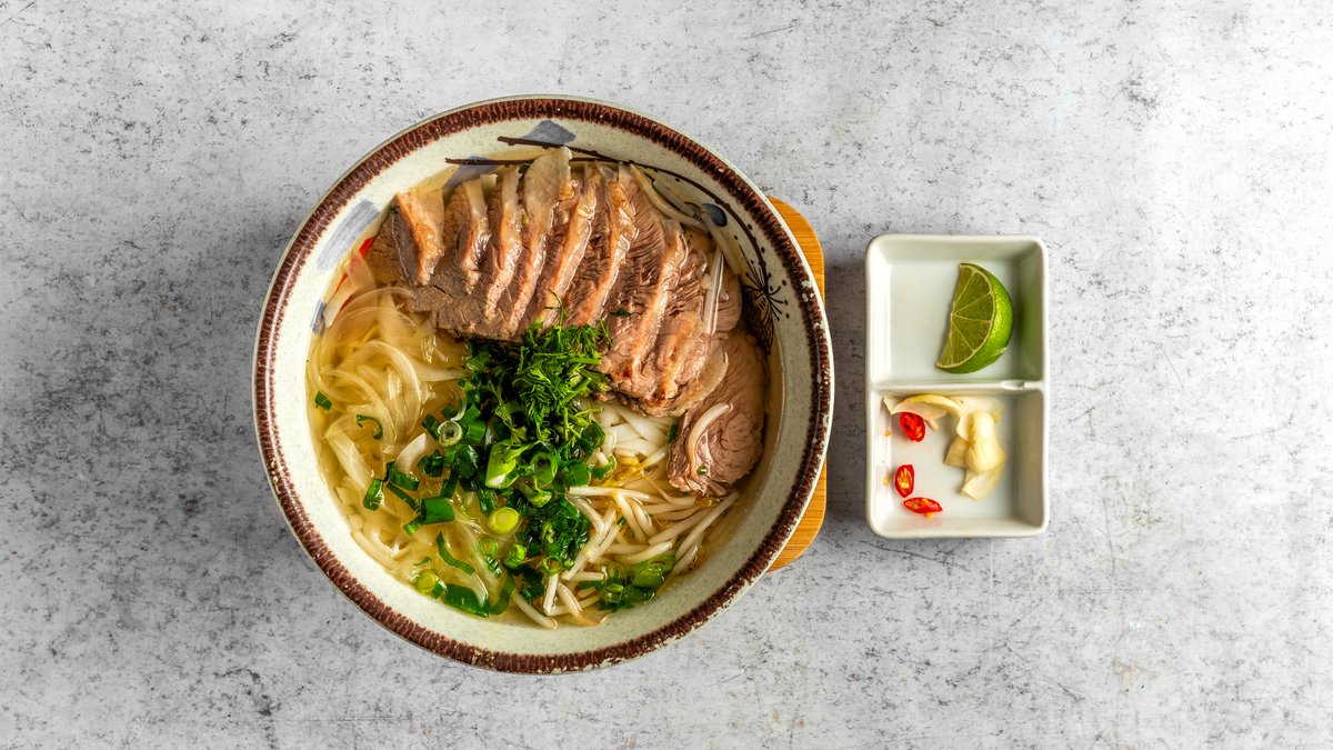(rice vermicelli, meat broth, onion, bean sprouts, coriander)