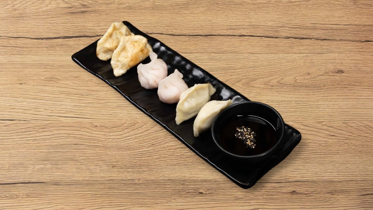2 garnélarák gombóc, 2 gőzölt sertés gyoza, 2 sült sertés gyoza 2 shrimp dimsum, 2 steamed pork gyoza, 2 fried pork gyoza