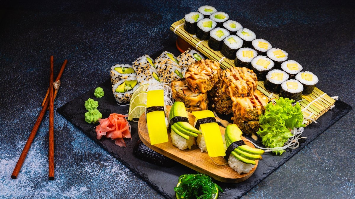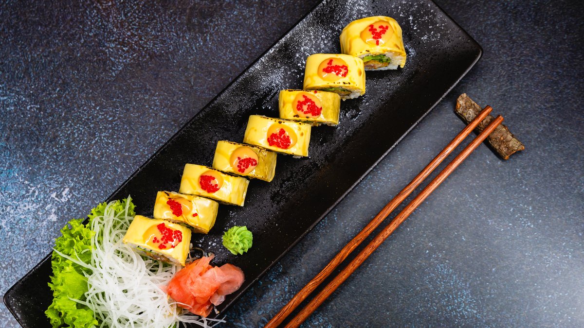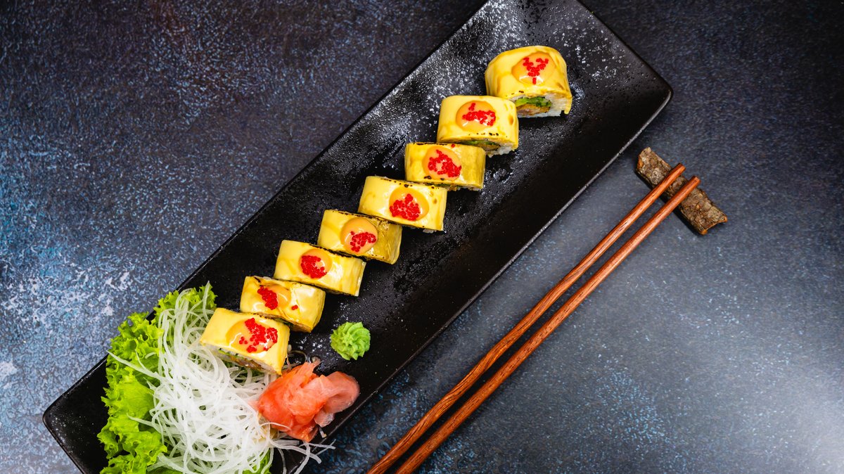 masago, surimi, omlett, avókádó, uborka masago, surimi, omelette, avocado, cucumber