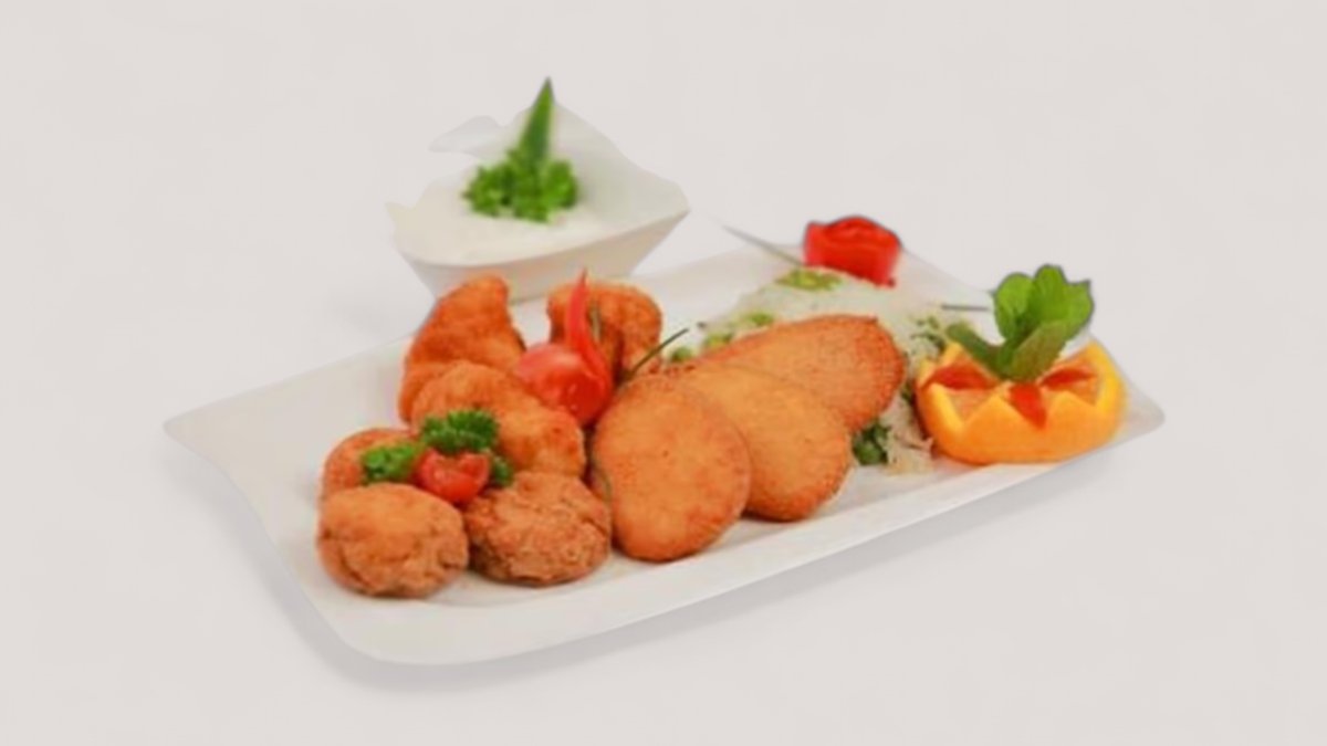 1 rántott csirkemell 1 párizsi szelet, 1 rántott camembert, 1 rántott sajt, 1 Cordon Bleu, 2 öntet