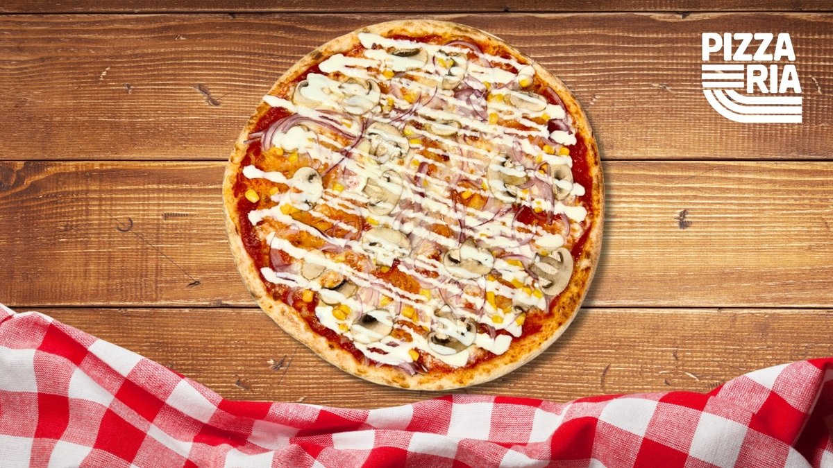 paradicsomszósz, mozzarella sajt, kukorica, gomba, lilahagyma, fokhagymás majonéz