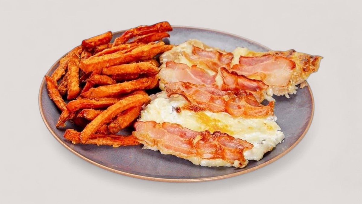 Roston Karaj fokhagymás-paprikás pácban, ropogósra sütve, és füstölt szalonnával tálalva