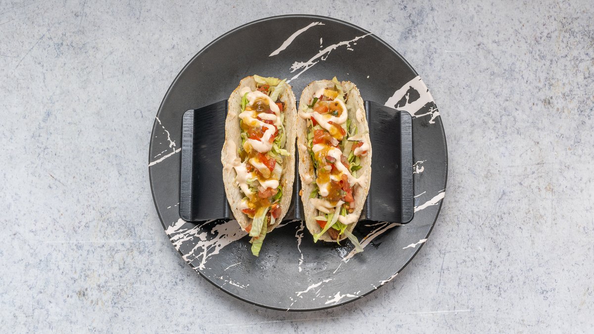 Tortilla (30 cm), sajt, al pastor csirkecomb, mexikói rizs, jégsaláta, pico de gallo, krémes jalapeño szósz, kukorica, grillezve