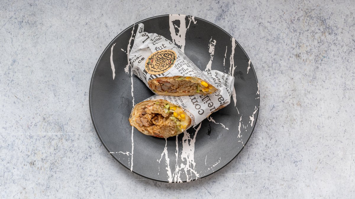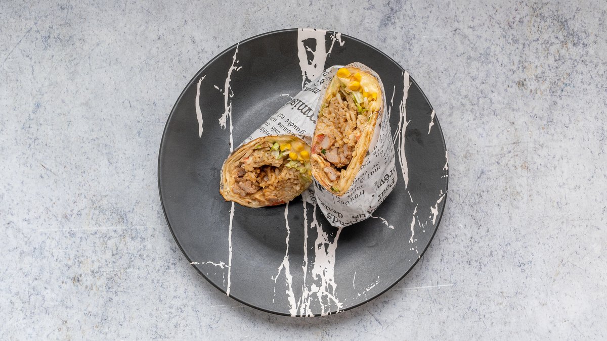 Tortilla (30 cm), sajt, chorizo kolbász, mexikói rizs, jégsaláta, hagyma, jalapeño, krémes chipotle szósz