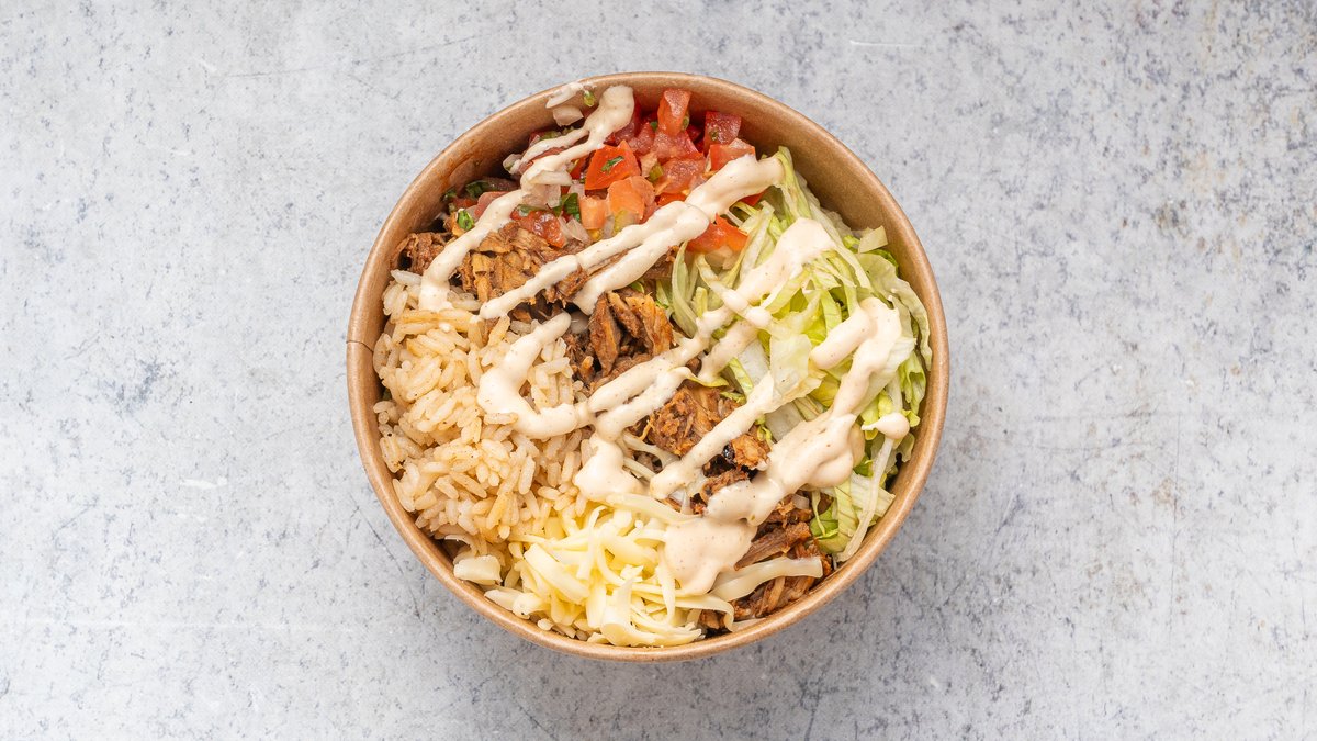 Mexikói rizs, csirke vagy tépett sertéshús, pico de gallo, kukorica, sajt, jégsaláta, krémes jalapeño szósz