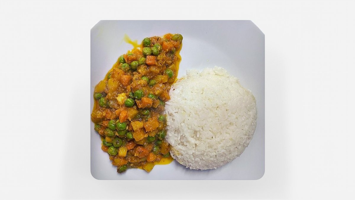 Fűszeres vegyes zöldségek ízletes curry szószban, basmati rizzsel tálalva.