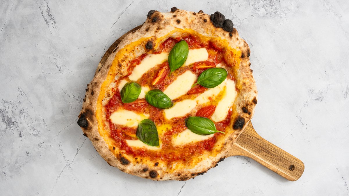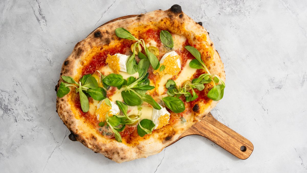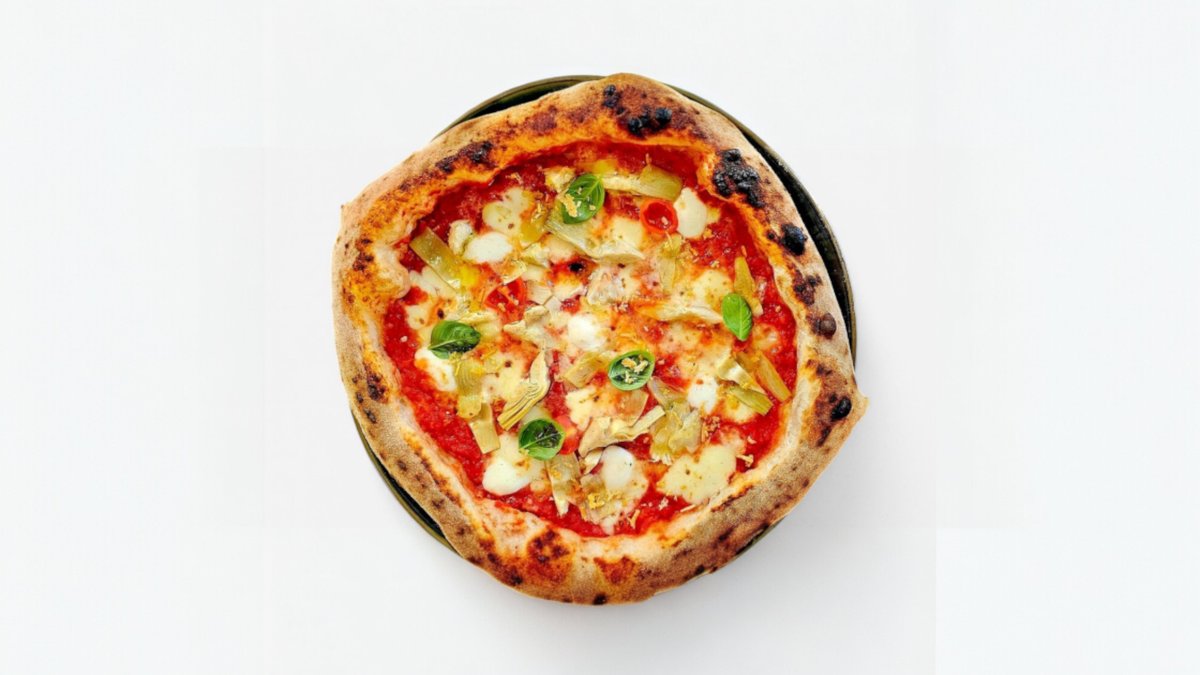 Paradicsomos alap, parmezán, fior di latte, articsóka, bivalymozzarella, olívaolaj, bazsalikom