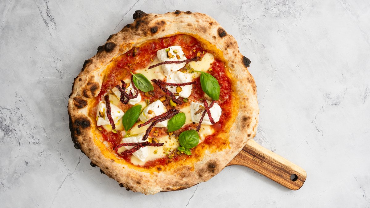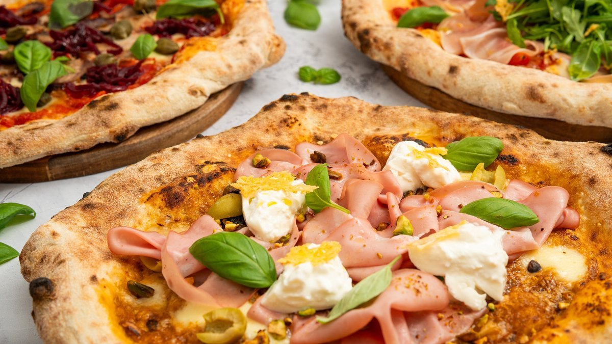 piros pesto alap, parmezán, fior di latte, mortadella, pirított pisztácia, olívaolaj, olívabogyó, bazsalikom