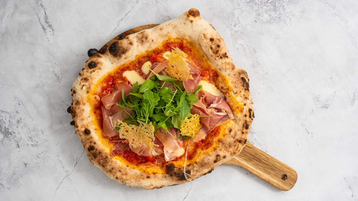 paradicsomos alap, parmezán, fior di latte, koktélparadicsom, crudo sonka, rukkola, olívaolaj, bazsalikom