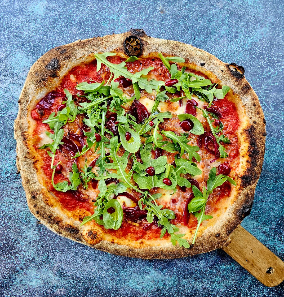 paradicsom alap, parmezán, fior di latte, pancetta, lilahagyma lekvár, málna, rukkola, bazsalikom