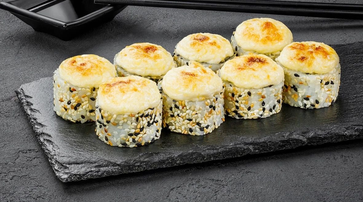 Rizs, lazac, uborka, jégsaláta, avokádó, sajt, tempura liszt, panko morzsa, mogyorószósz, majonéz, sriracha szósz, szezámmag, zöldhagyma, nori