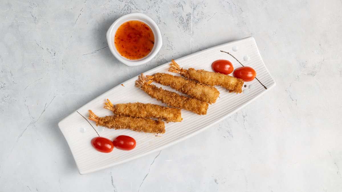 Ropogósra sült zöldséges tekercsek, könnyű, ízletes előétel édes-chilis szósszal tálalva.
