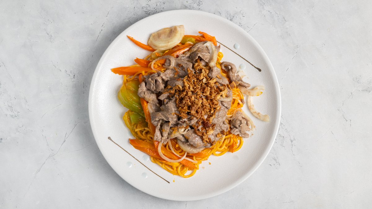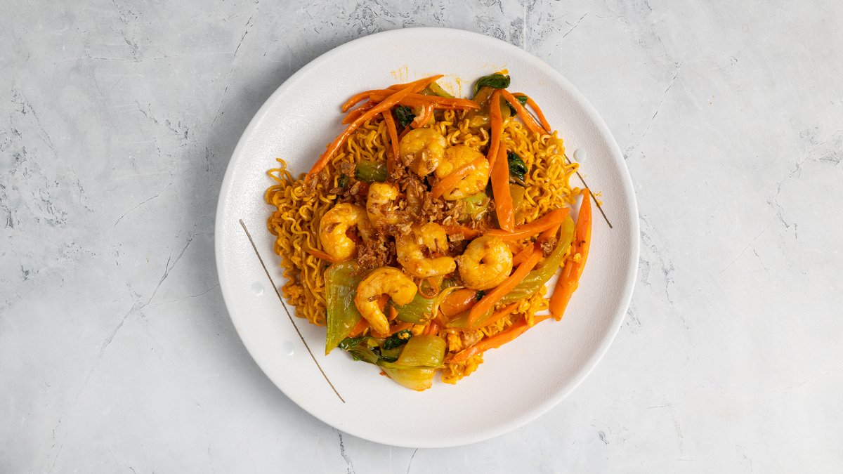 Wokban pirított tintahal zöldségekkel és ízletes sült tésztával, ázsiai fűszerekkel.