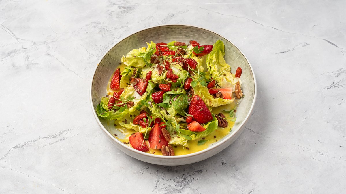 Szívsaláta, gyümölcs, goji bogyó, pekándió, ponzu (rizsecet, mirin, szárított tonhal pehely, szója szósz), chia mag, citrusos mártás