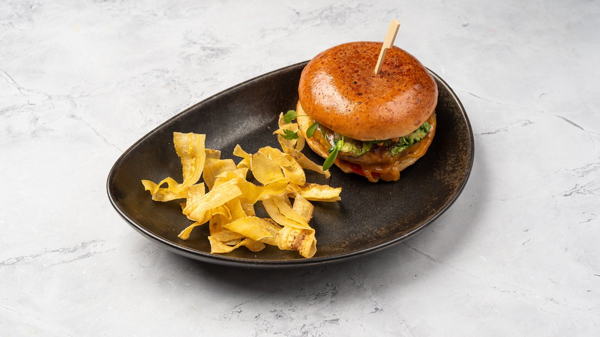 Angus 150g húspogácsa, saláta, lilahagyma lekvár, koriander, cheddar, gochujang szósz, platanitos chipssel és házi kolumbiai aguapanela itallal.