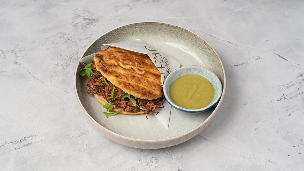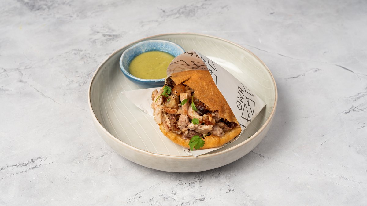 Venezuelai sült arepa (kukoricalisztes tészta), ropogós sertéscsászár, lime, koriander, sajt, salsa verde szósz (zöldparadicsom, lime, koriander, zöld chili)
