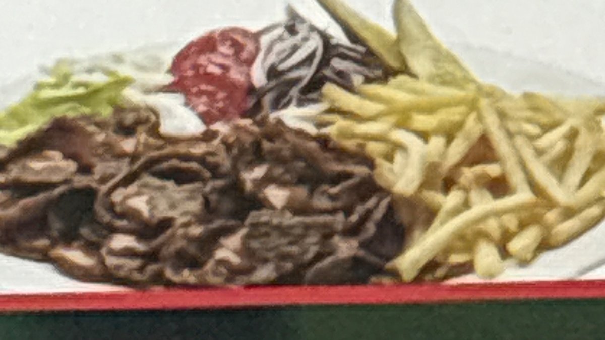 csirkehús, saláta, káposzta, paradicsom, hagyma, saláta, csípős szósz, joghurtszósz, választható köret (Kérlek, válassz hozzá köretet!). - A kép illusztráció.