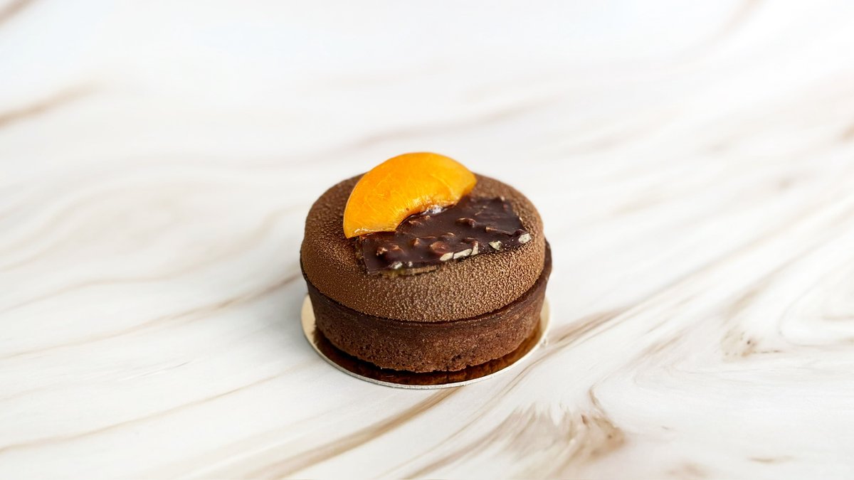 Mogyoró mousse desszert, amely a közepén egy mogyorós tekercset rejt, a tetején yuzu (japán citrom) habbal és yuzu pöttyökkel, roppanós tejcsokoládés burokban.