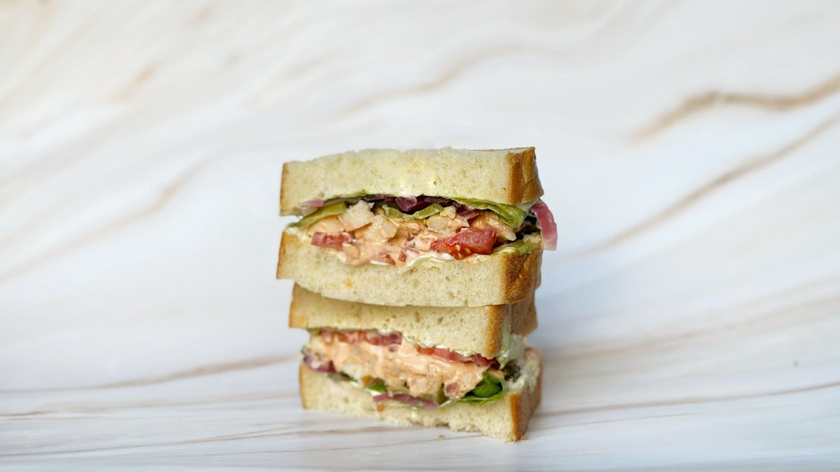 Klasszikus tonhalas szendvics extra tojáskrémmel, friss paradicsommal és salátával, a saját marinált, ecetes hagymánkkal.