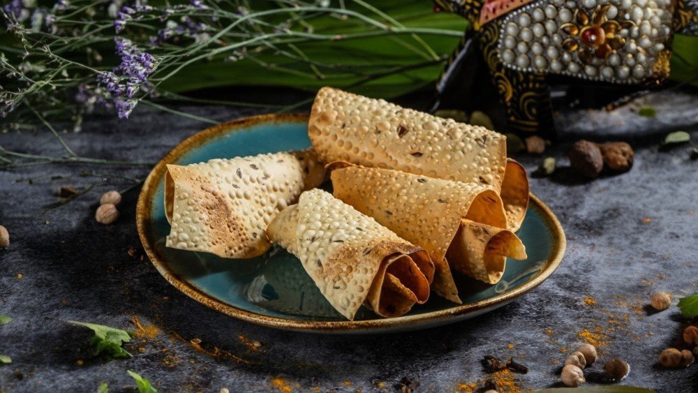 Crisp and salty urid lentil wafer with cumin roasted in tandoori oven // Tandoori kemencében sült ropogós lencse alapú sós, rómaiköményes ostya