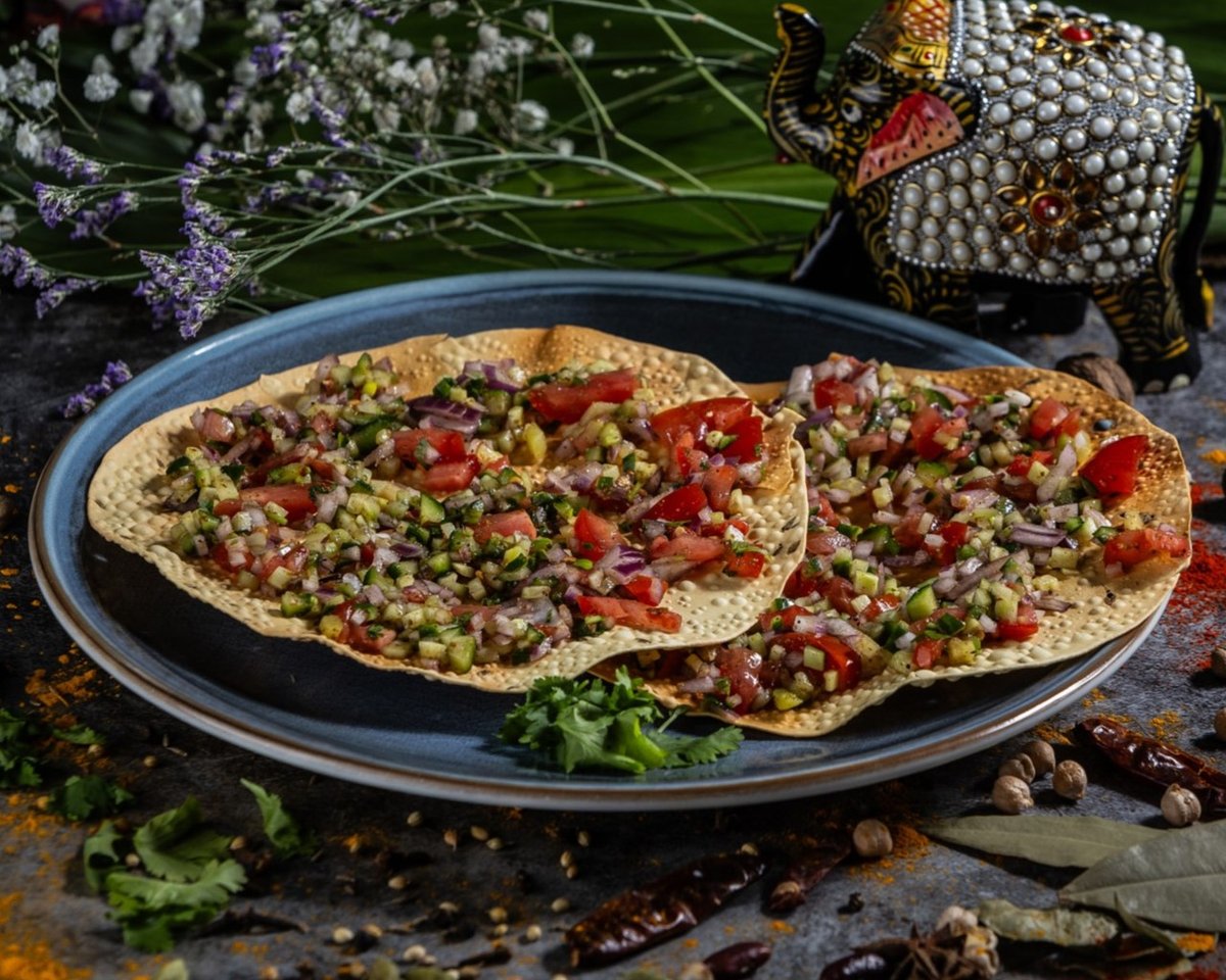 Ropogós pappad, burgonya hagyma keverékével // Crispy pappad garnished with potatoes and onions