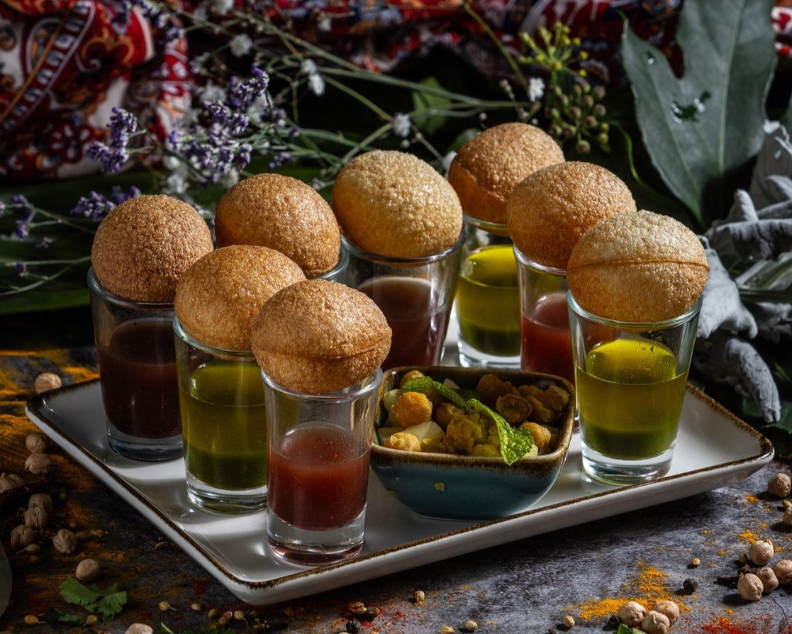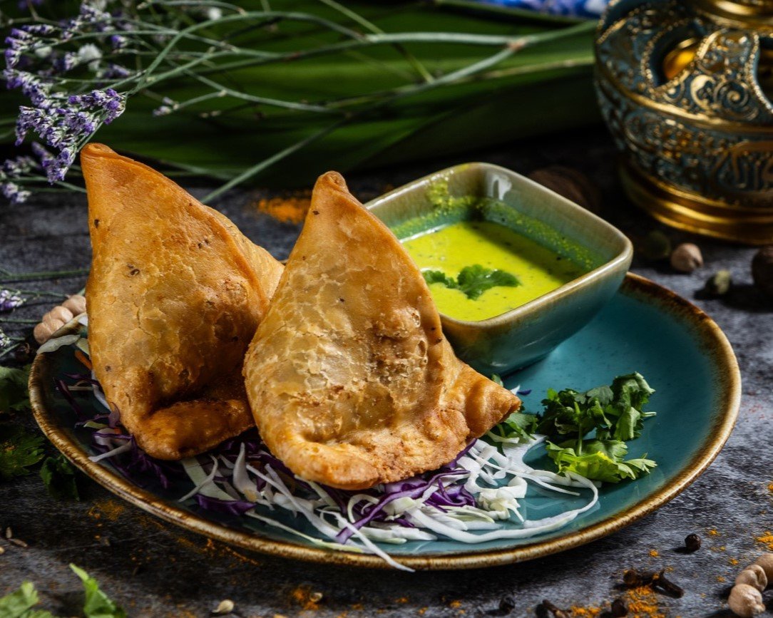 Ropogós kagyló formájú sült leveles tésztafalatok zöld chilis borsóval és fűszeres burgonyával töltve, édes és csípős szósszal tálalva // Crispy shell-shaped fried pastry stuffed with green chili, peas, spicy potatoes and onion, served alongside sweet and spicy sauce