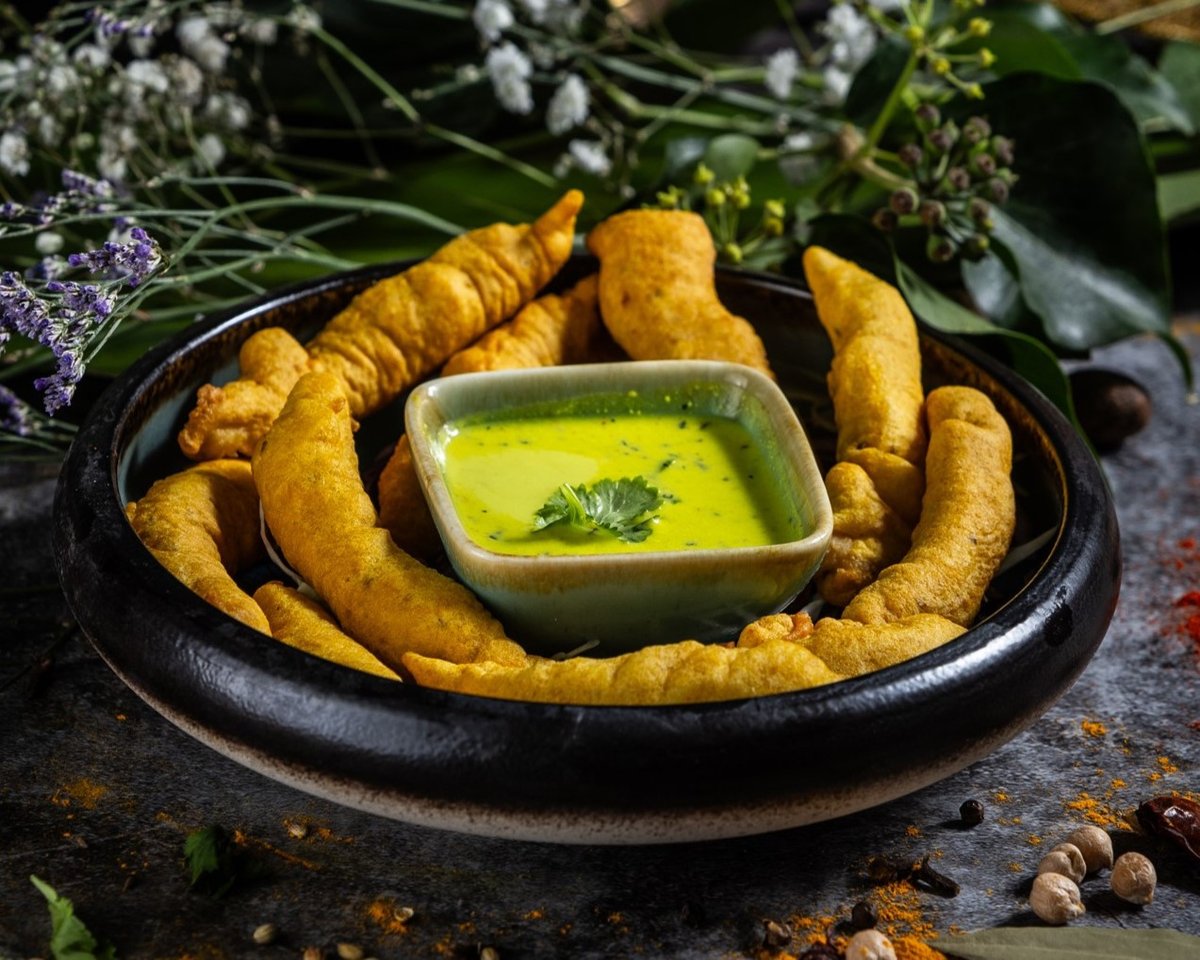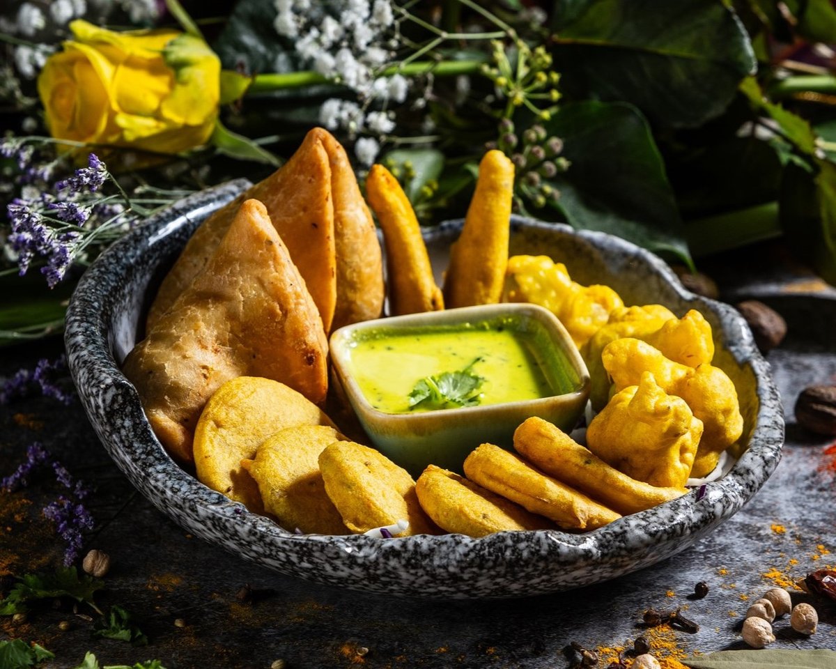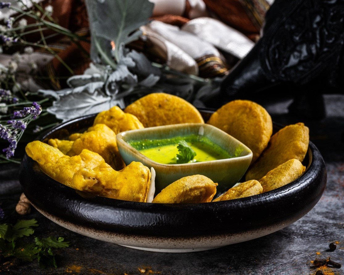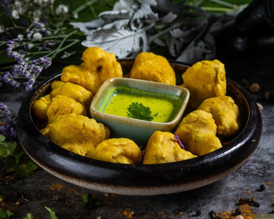 Fűszeres csicseriborsóliszt bundában sült zöldségek és paneer sajt, tamarind és menta szósszal tálalva. // Vegetables and homemade paneer cheese fried in seasoned batter, served with tamarind and mint sauce