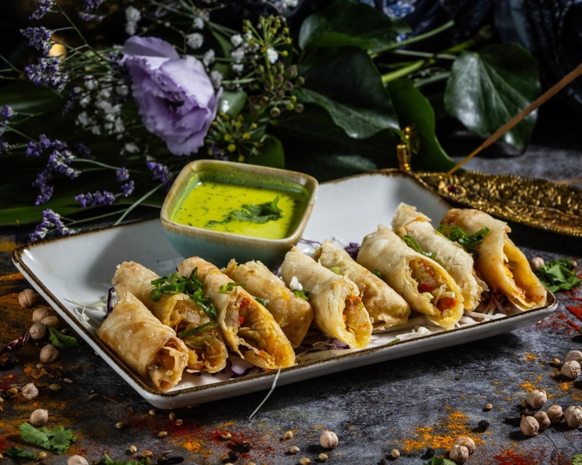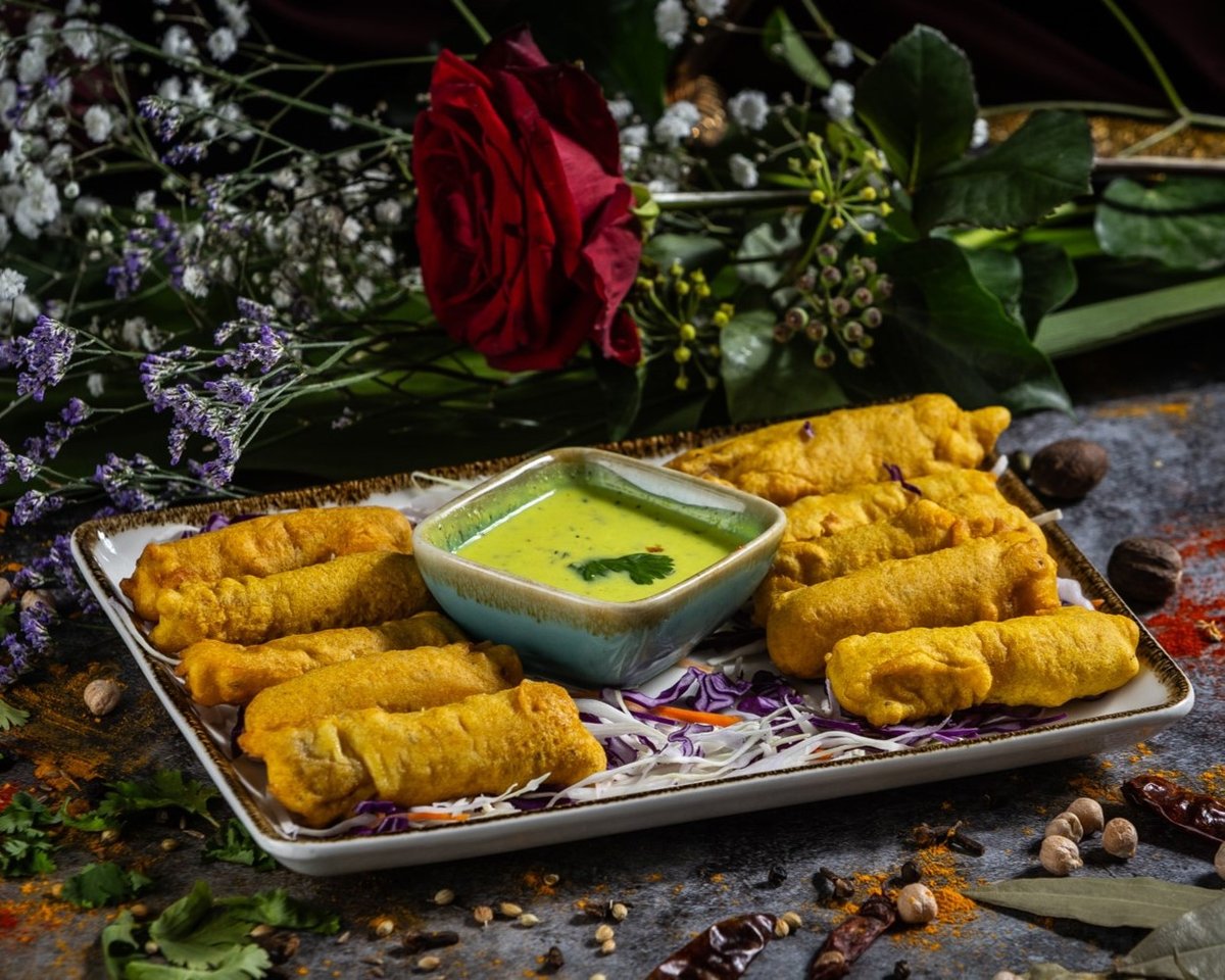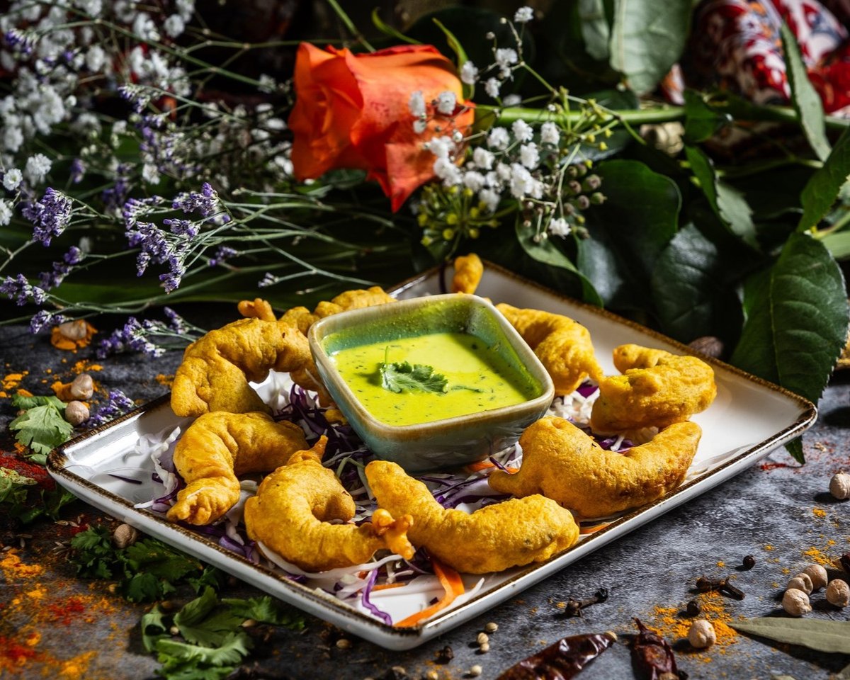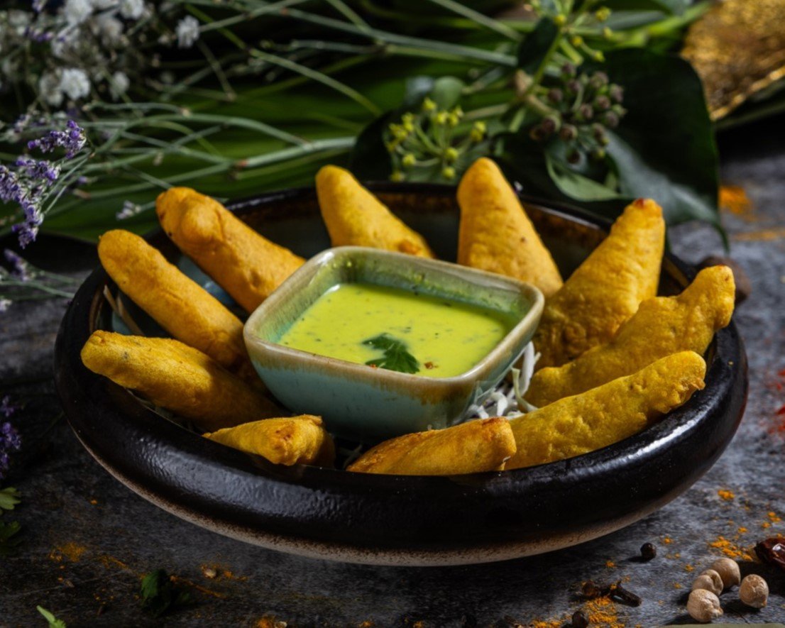 Fűszeres csicseriborsóliszt bundában sült zöldségek és paneer sajt, tamarind és menta szósszal tálalva. // Vegetables and homemade paneer cheese fried in seasoned batter, served with tamarind and mint sauce