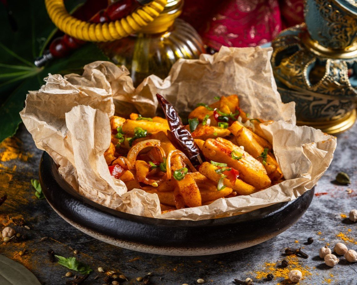 Sült hasábburgonya chili szószban forgatva // French fries mixed with chili sauce