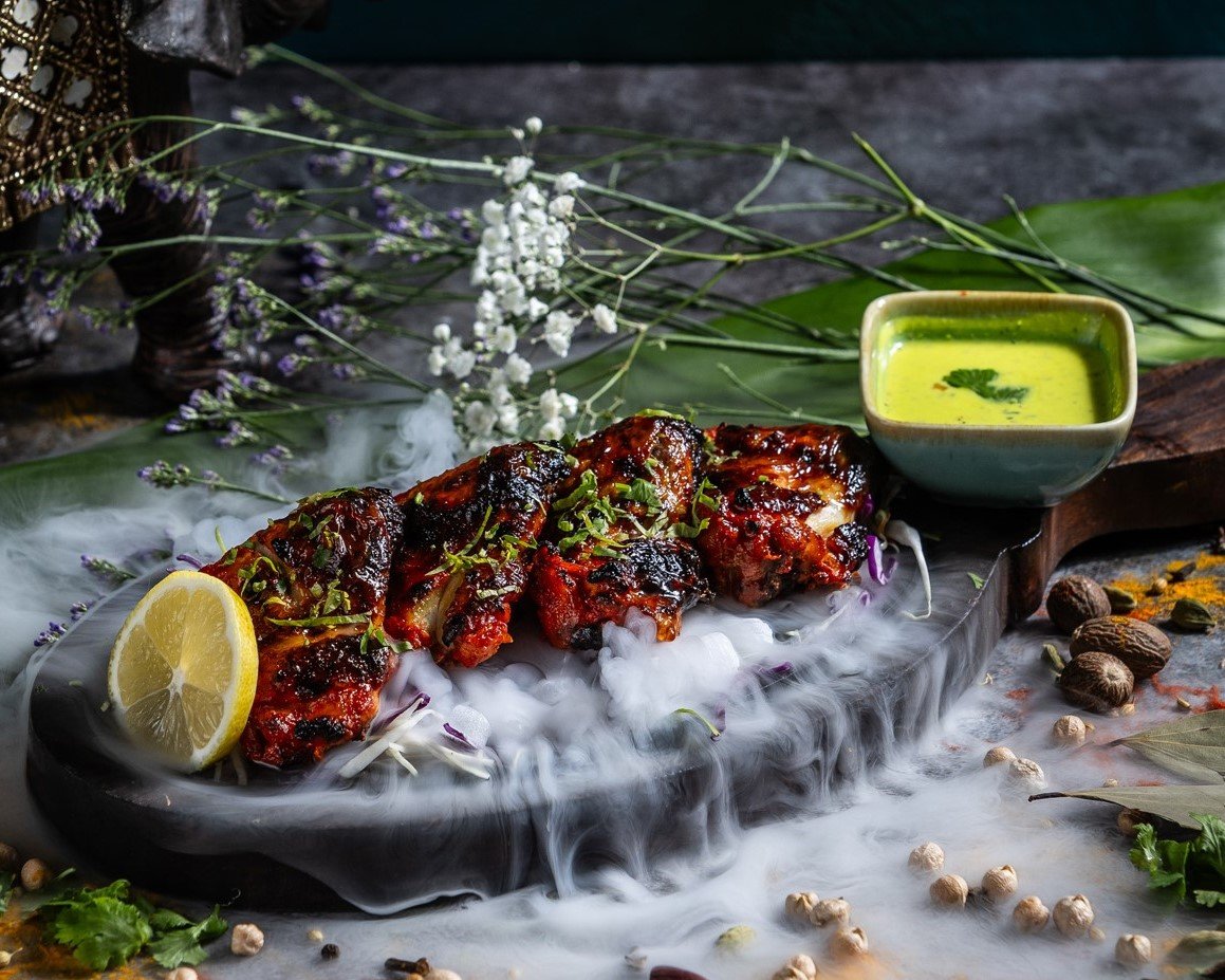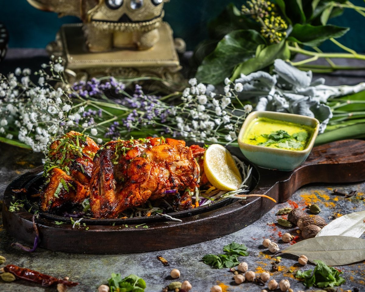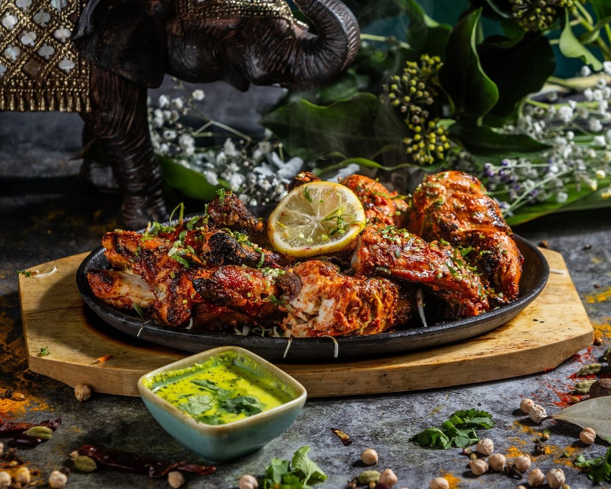 Fokhagymás-gyömbéres, fűszeres joghurtban pácolt, majd tandoorban grillezett egész csirke // Seasoned yoghurt and ginger-garlic marinated whole chicken, grilled in tandoor oven