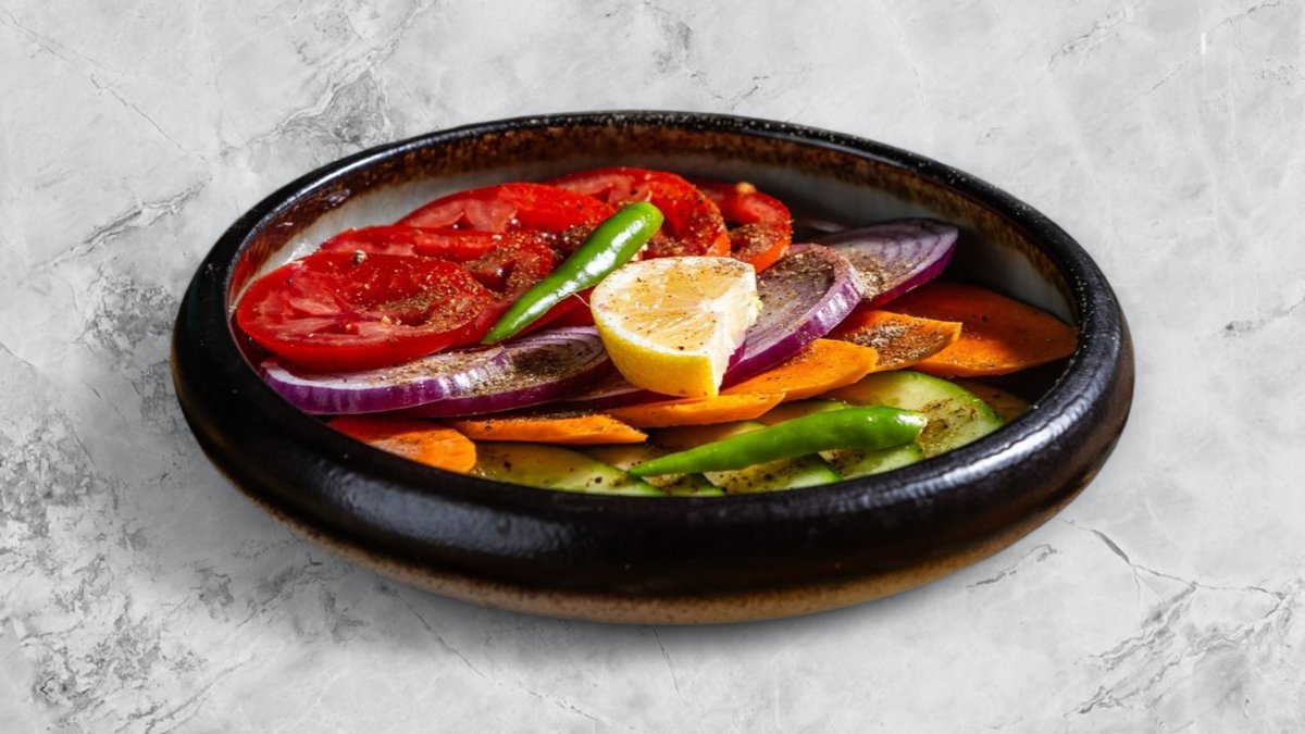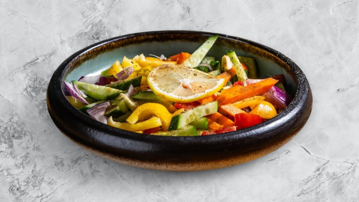 Apróra vágott paradicsom, uborka és hagyma saláta, saját házi salátaöntetünkkel // Diced salad of tomatoes, cucumber and onions topped with our homemade salad dressing