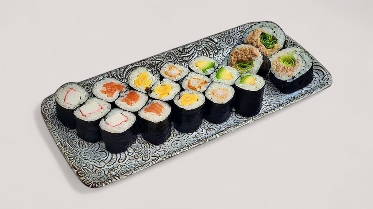 3 lazac, 3 surimi, 3 uborka, 3 omlett, 3 vörös tonhal, 3 avokádó. Allergének: glutén, rák, tojás, hal