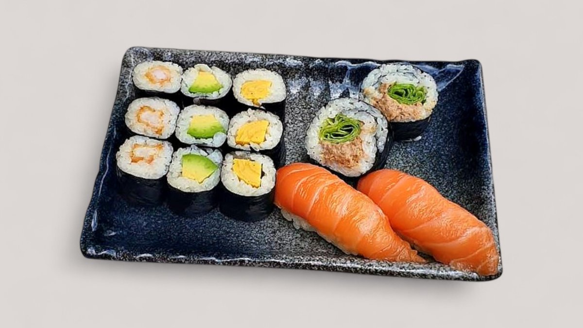 2 lazac, 2 tigrisrák, 2 omlett, 2 surimi nigiri sushi, 3 uborka maki, 3 ropogós rák maki. Allergének: glutén, rák, tojás, hal