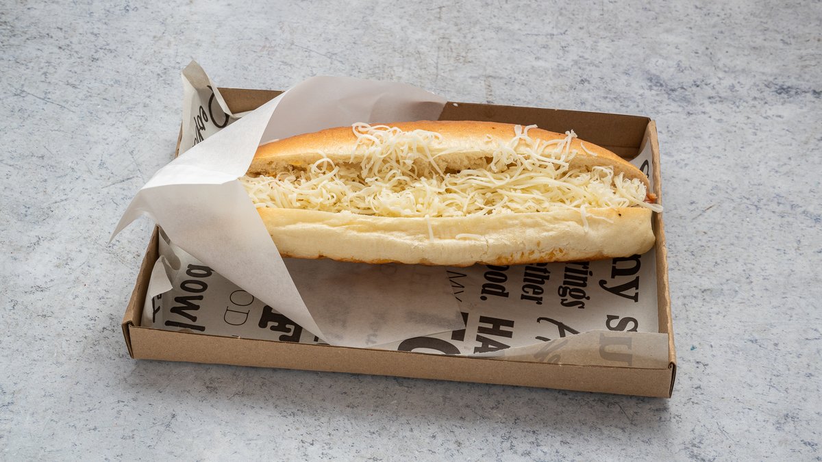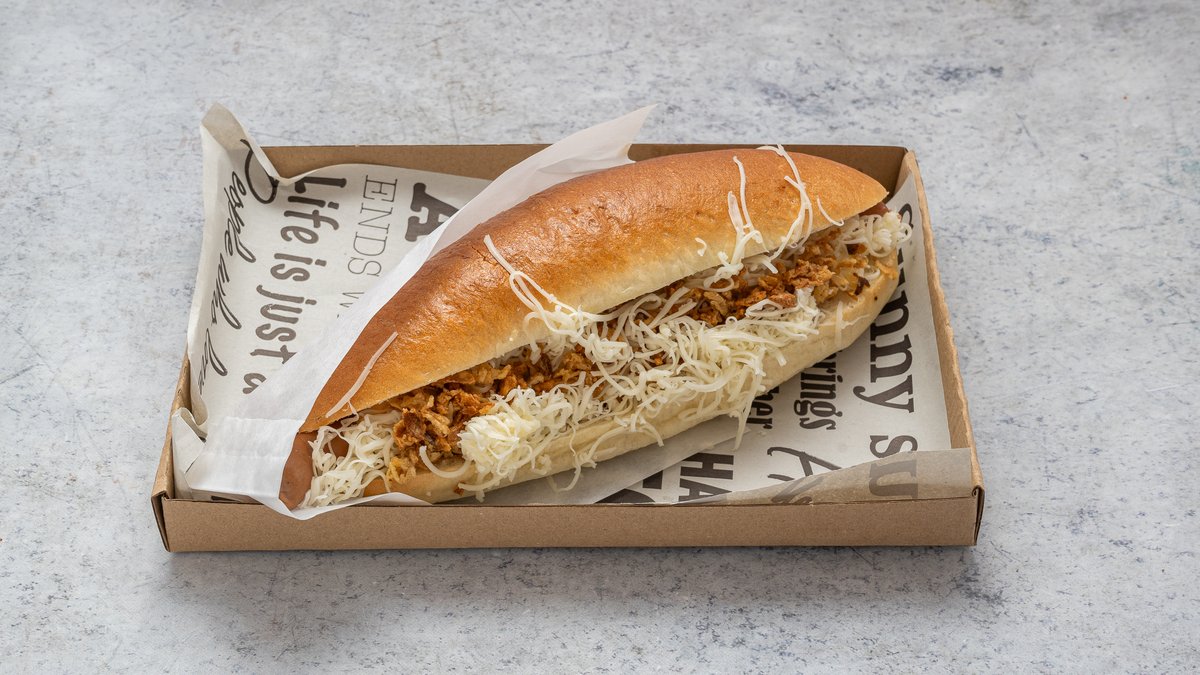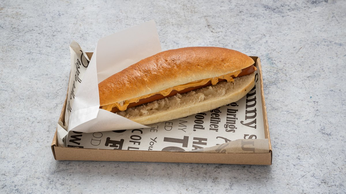 Hot-dog kifli, virsli, sajt, pirított hagyma, hambi szósz