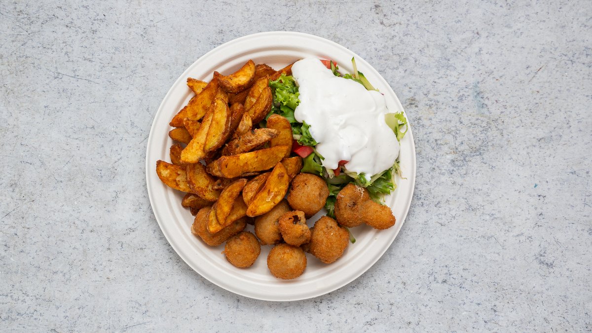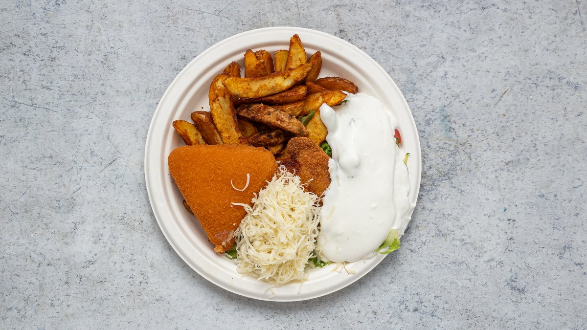 Buci, gyros hús, saláta, paradicsom, uborka, lilahagyma, öntet