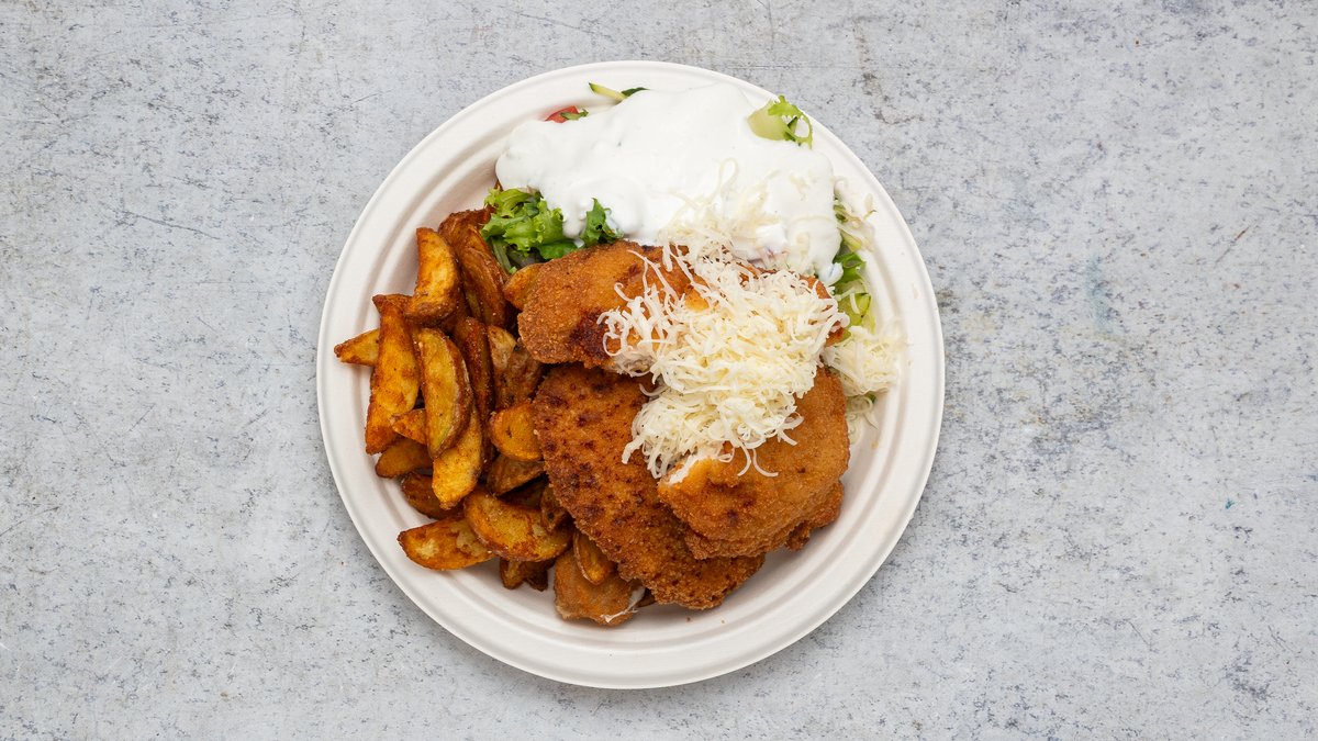 Sajt, hasábburgonya, saláta, öntet