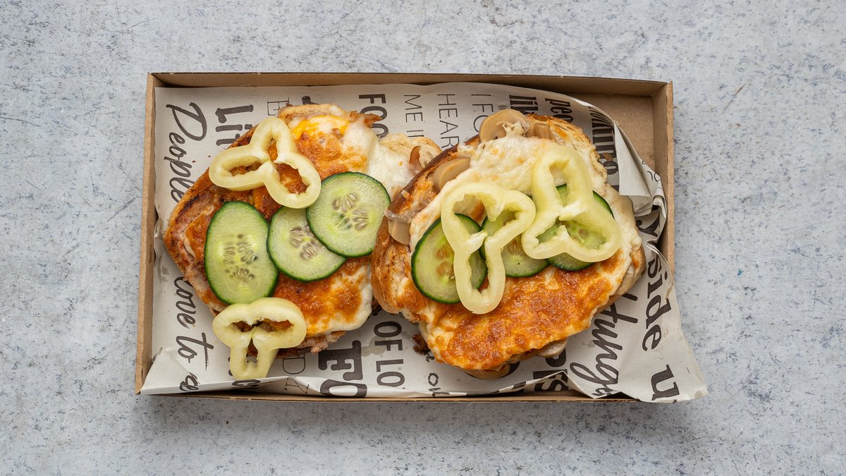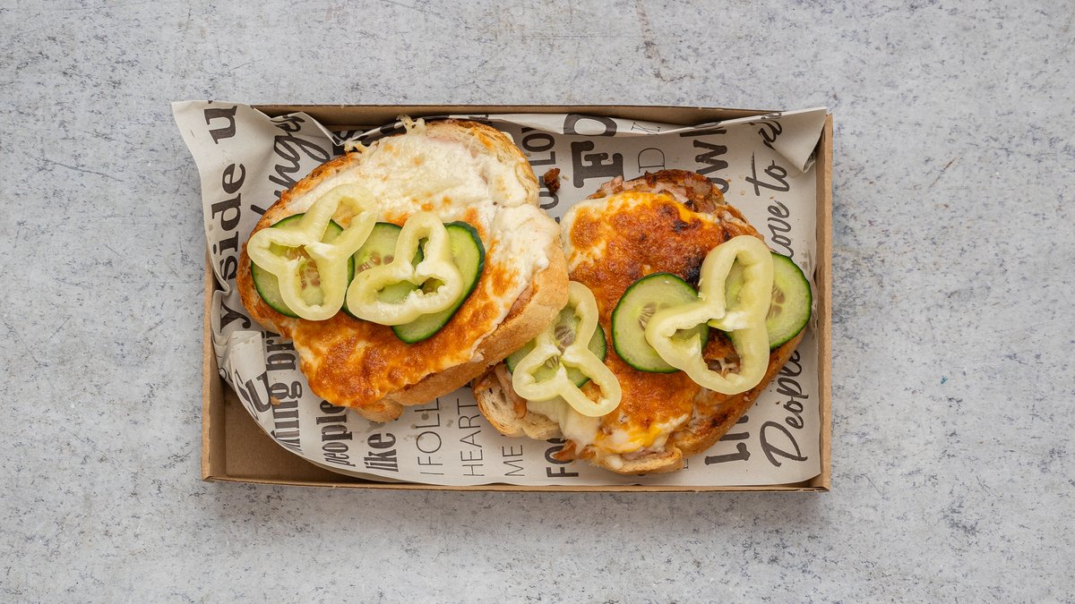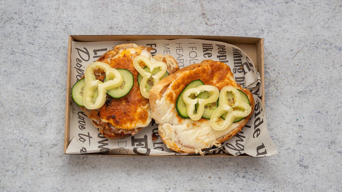 Kenyér, gomba, szendvicskrém, pirított hagyma, paradicsom, sajt, választható szósz