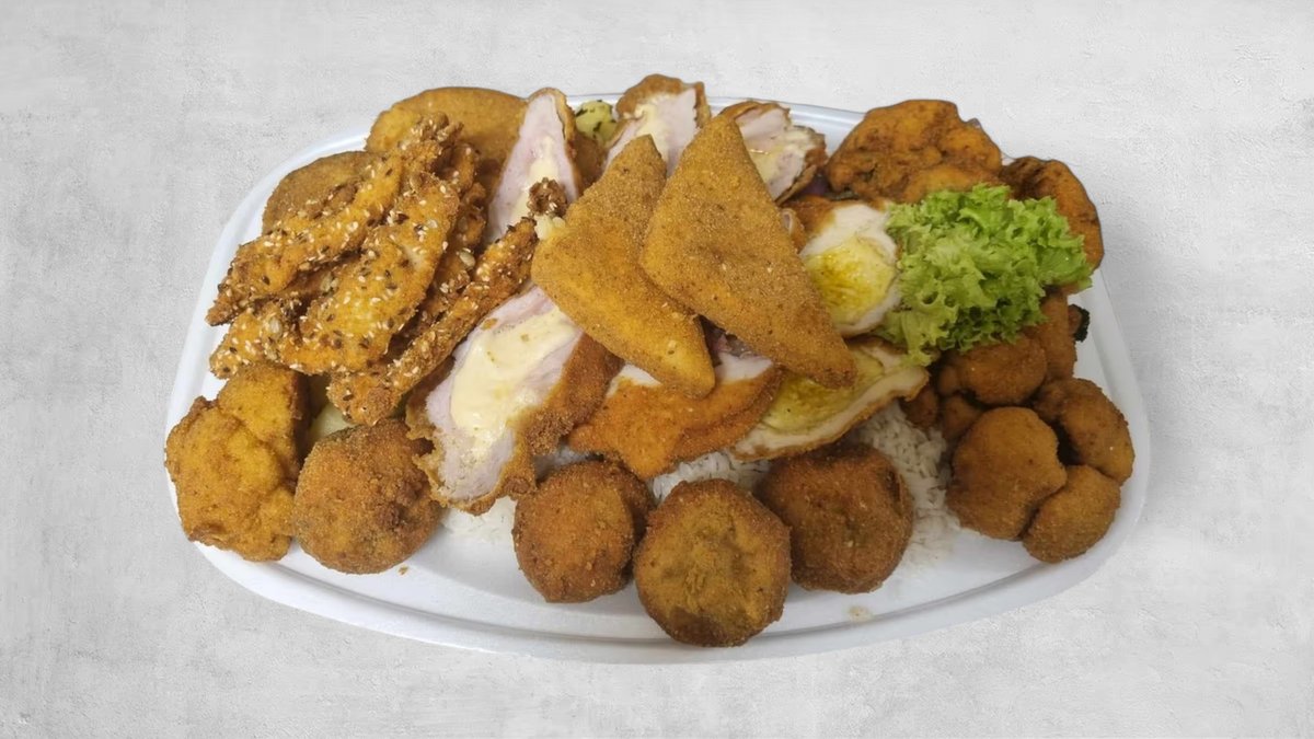 Royal csirkemell, fokhagymás csirkemell csikok magvas bundában, rántott sajt, rántott karfiol, sajttal gombával töltött sertésborda, rántott szelet választható körettel