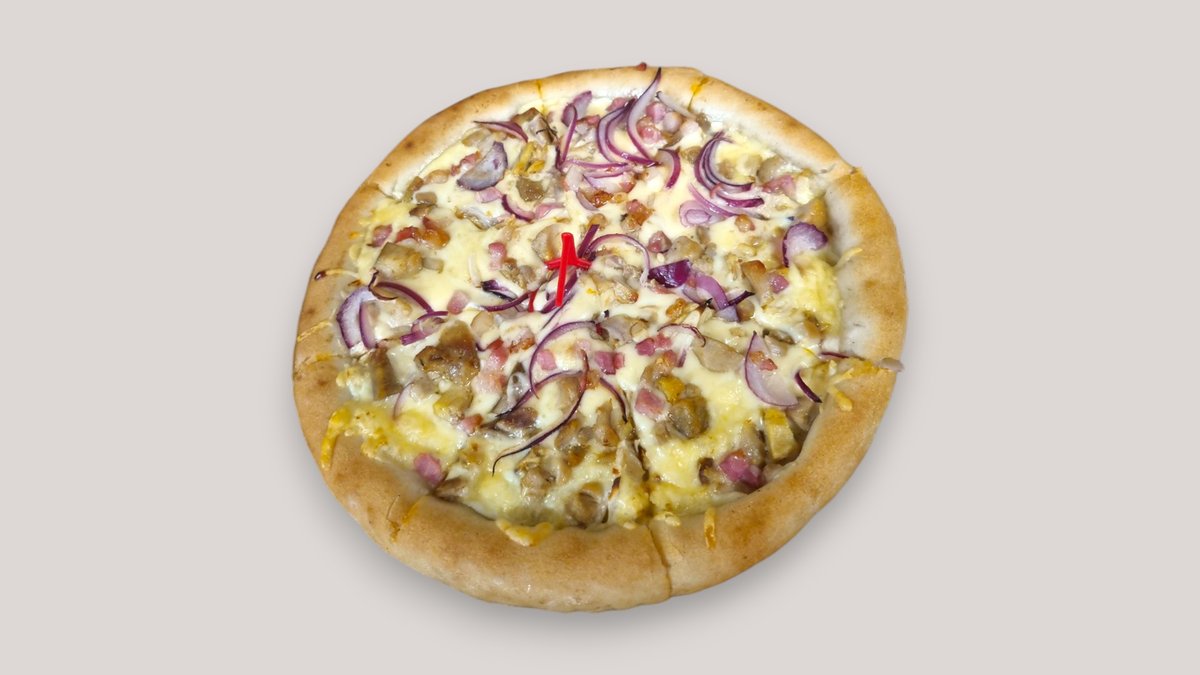 Fokhagymás tejfölös alap, bacon, gyros hús, lilahagyma, füstölt sajt