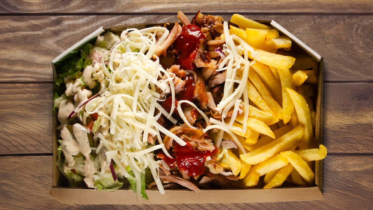 döner hús, sült burgonya, lilahagyma, jégsaláta, csemege uborka, paradicsom, doki öntet, kukorica, cheddarszósz